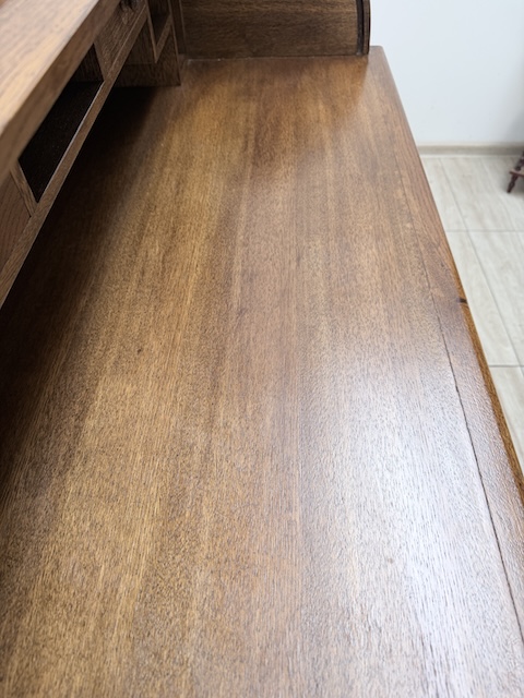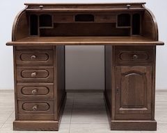 Biurko dębowe. Efektowne. Górna część zamykana drewnianą żaluzją. Pod blatem z prawej strony jest szuflada i szafka. Natomiast z lewej strony cztery praktyczne szuflady. Biurko jest solidnie wykonane i zachowane w dobrym stanie. Jego stan szczegółowo pokazany jest na zdjęciach. Do transportu rozłożony jest na trzy elementy. Biurko gotowe jest do wstawienia.