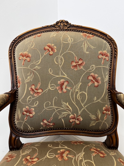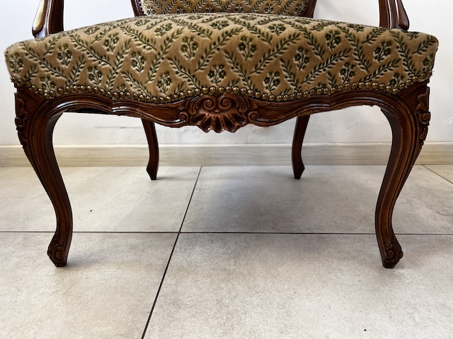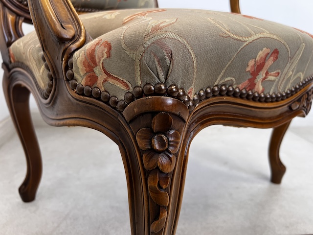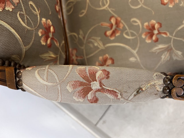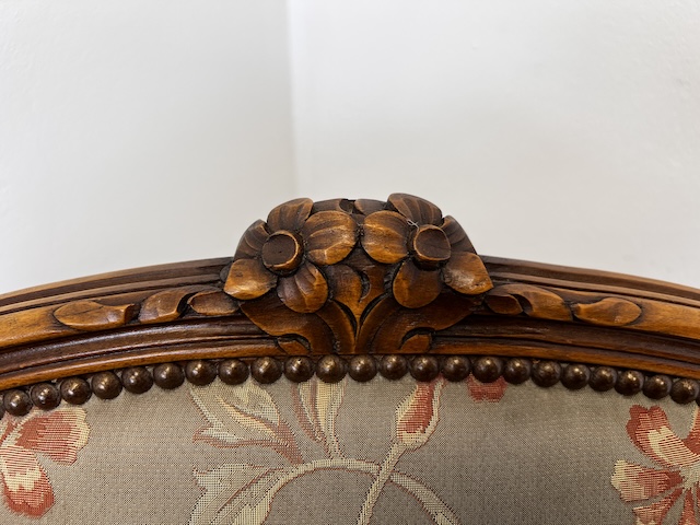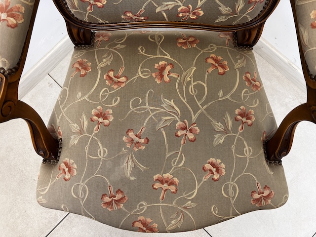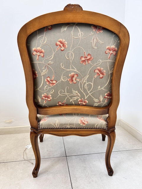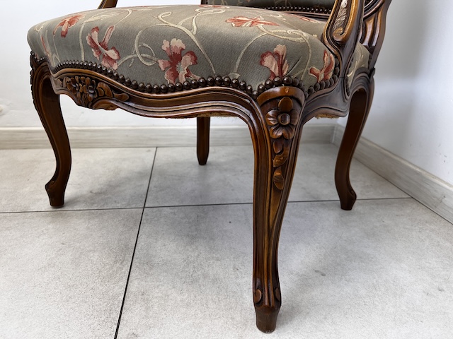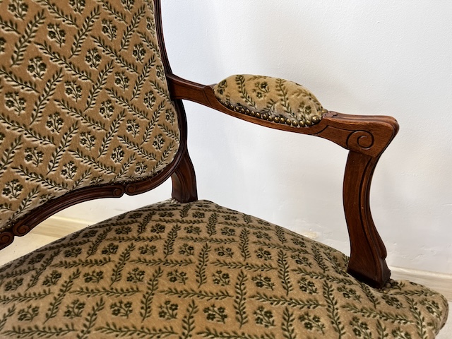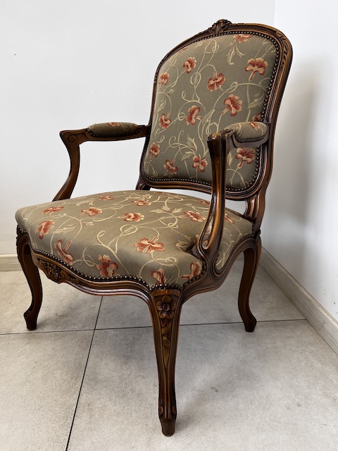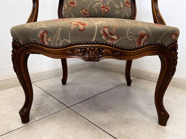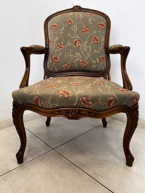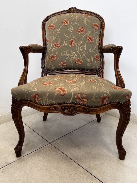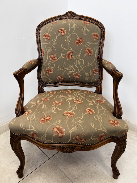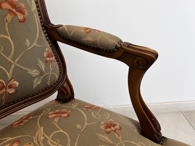 Fotel w stylu ludwikowskim. Bardzo ładny. Konstrukcja wykonana jest z drewna dębowego. Ładnie zdobiona. Tapicerowany jest tkaniną w beżowym kolorze w łososiowe kwiaty. Przetarty jest prawy podłokietnik. Na siedzisku jest delikatna, niewielka plamka. Poza tym fotel jest w dobrym stanie. Nie ma innych ubytków. Jest stabilny. Gotowy jest do wstawienia.