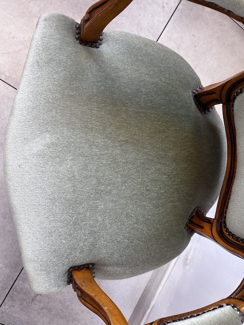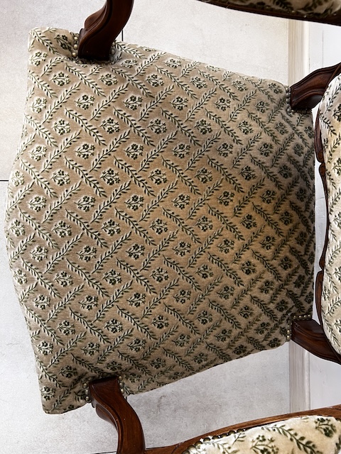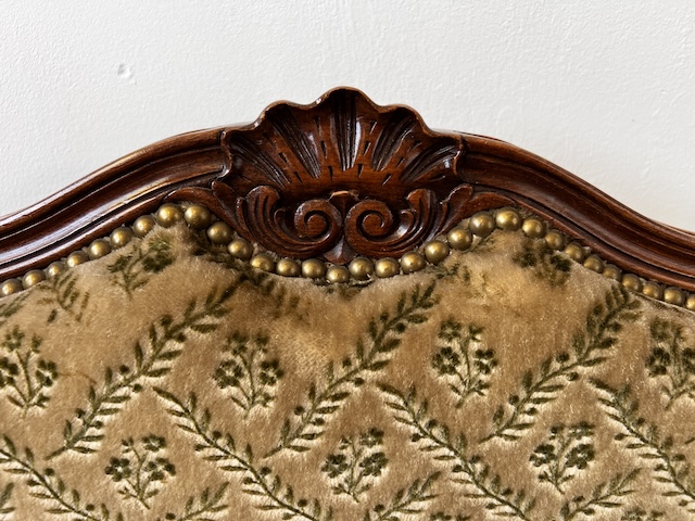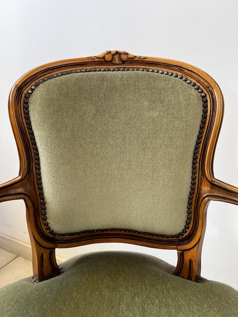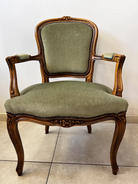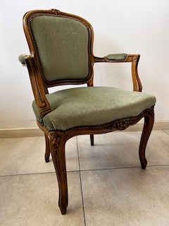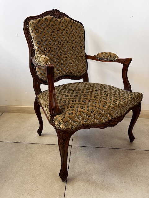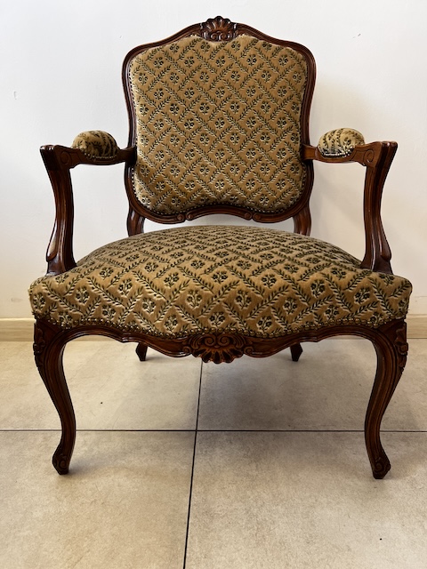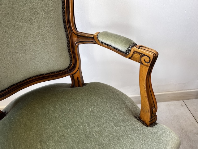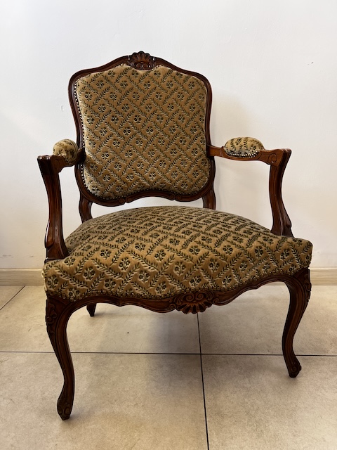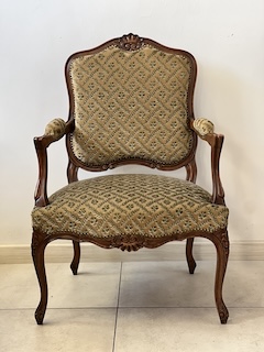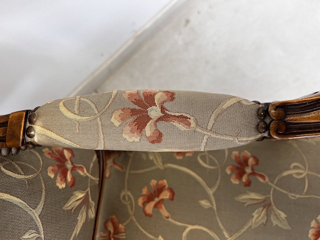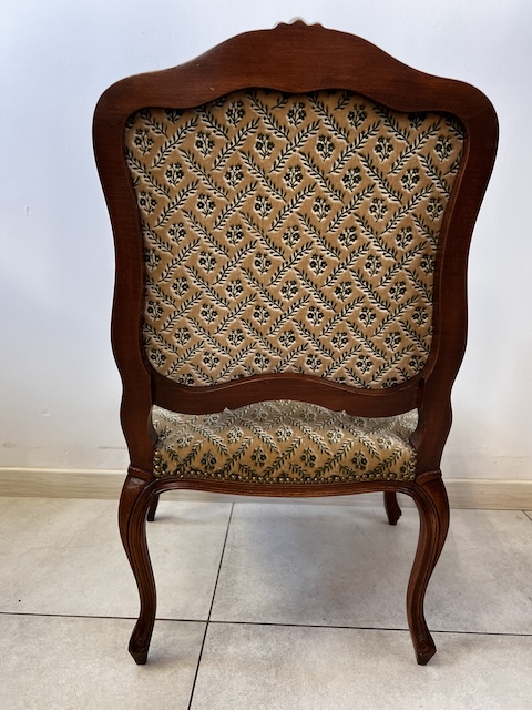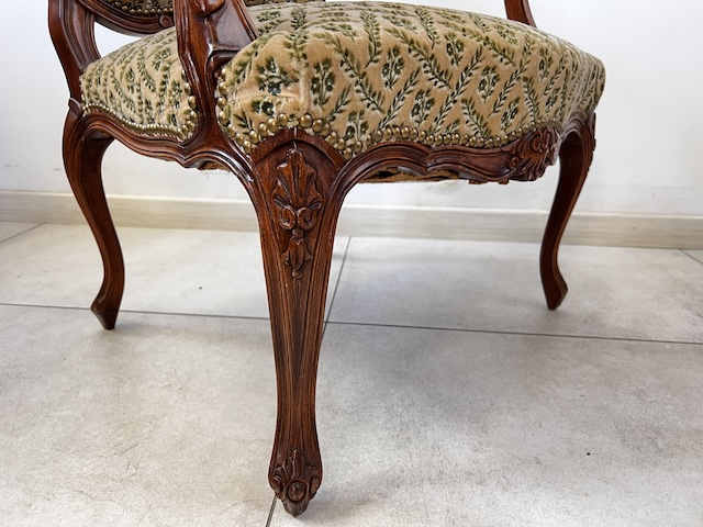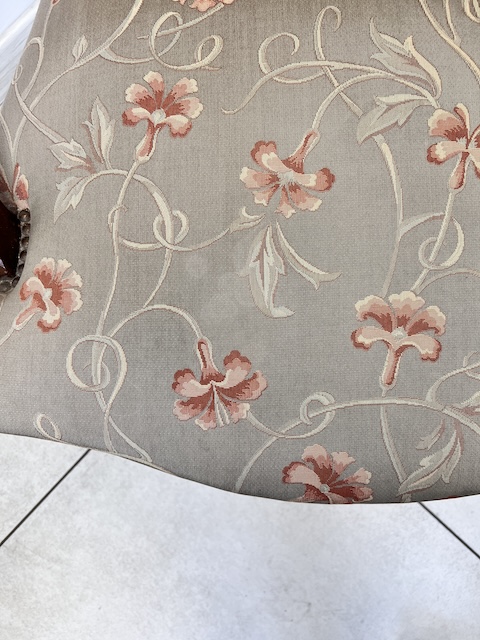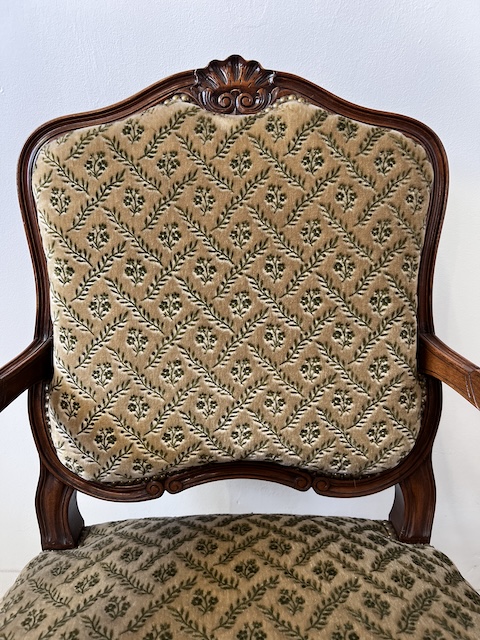 Fotel w stylu ludwikowskim. Bardzo ładny. Konstrukcja wykonana jest z drewna dębowego. Ładnie zdobiona. Tapicerowany jest tkaniną w beżowym kolorze w łososiowe kwiaty. Przetarty jest prawy podłokietnik. Na siedzisku jest delikatna, niewielka plamka. Poza tym fotel jest w dobrym stanie. Nie ma innych ubytków. Jest stabilny. Gotowy jest do wstawienia.