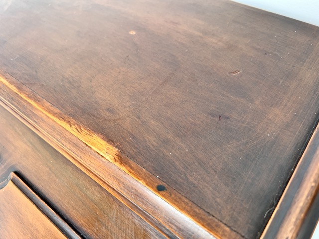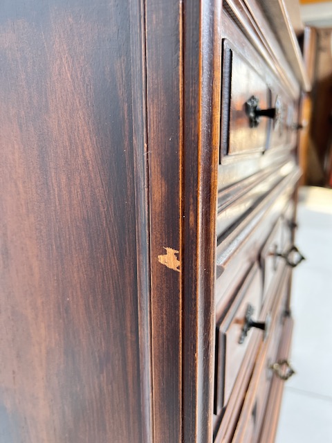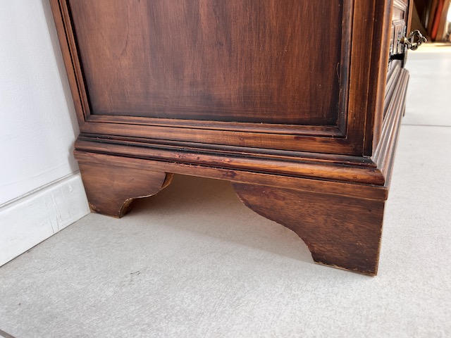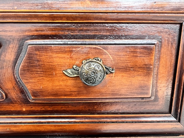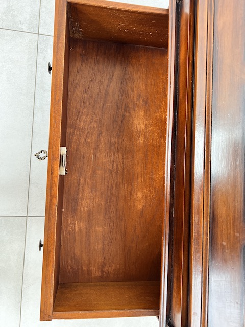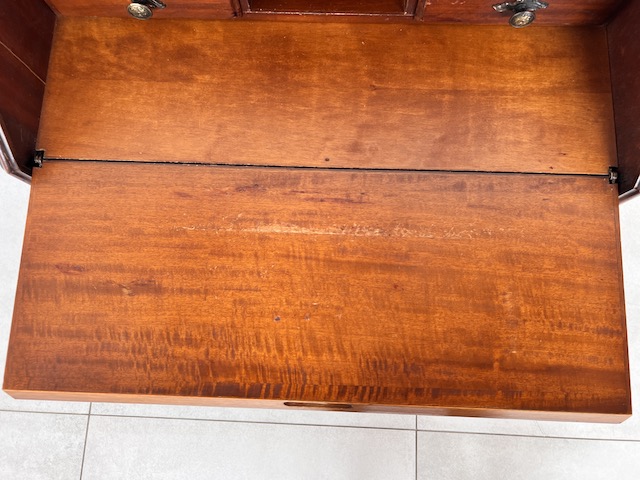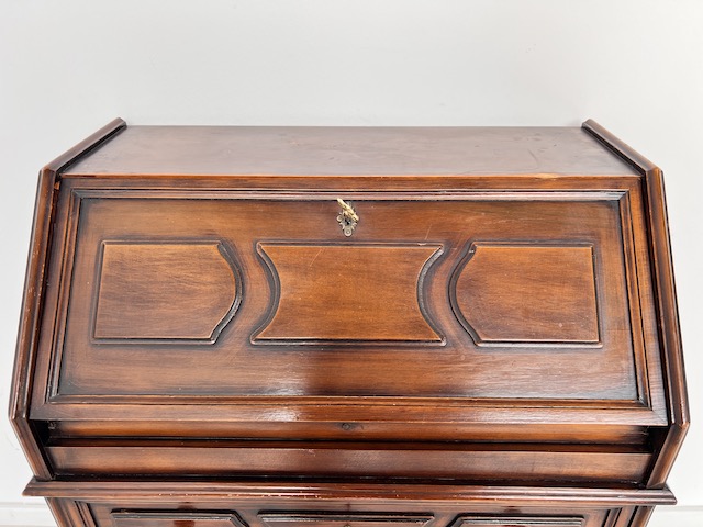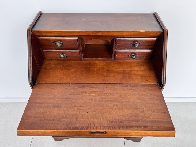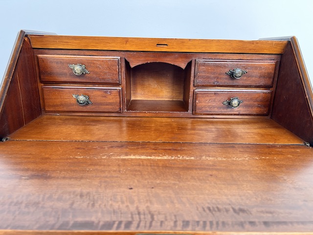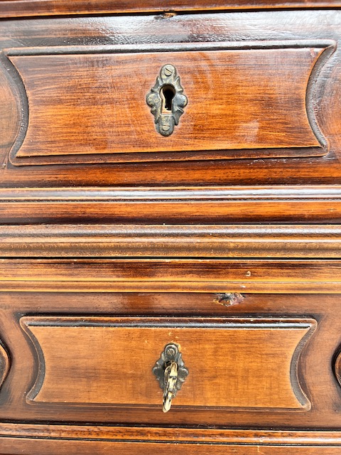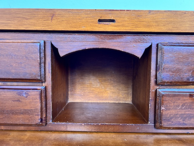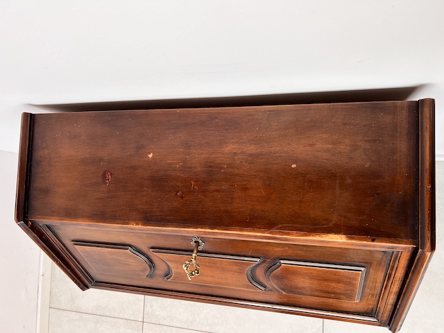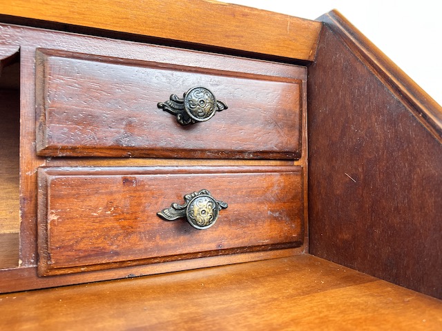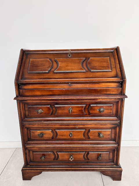 Stylowy sekretarzyk. Bardzo dobry model do stylizacji. Niewielkich rozmiarów. Stanie się efektowną ozdobą tam gdzie jest mało miejsca. Jest w dobrym stanie. Nie ma żadnych uszkodzeń ani ubytków. Nosi ślady użytkowania; drobne rysy i otarcia. Zamki są sprawne, również w szufladach z trzema kluczami w komplecie. Sekretarzyk jest gotowy do wstawienia.