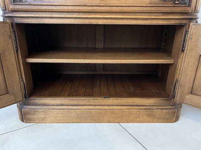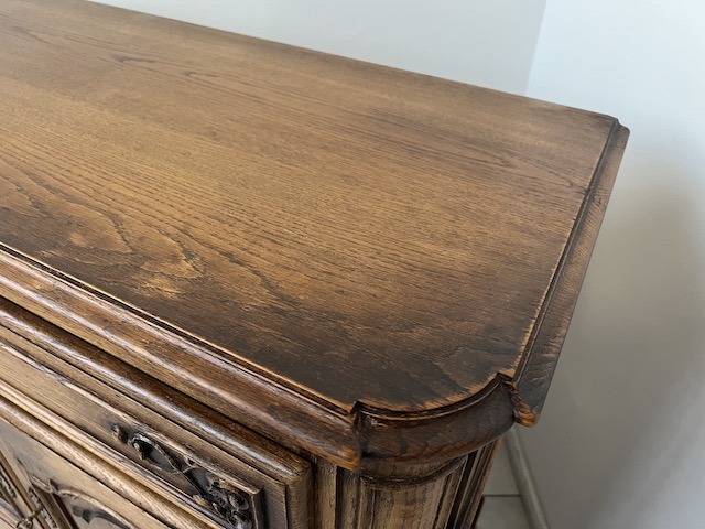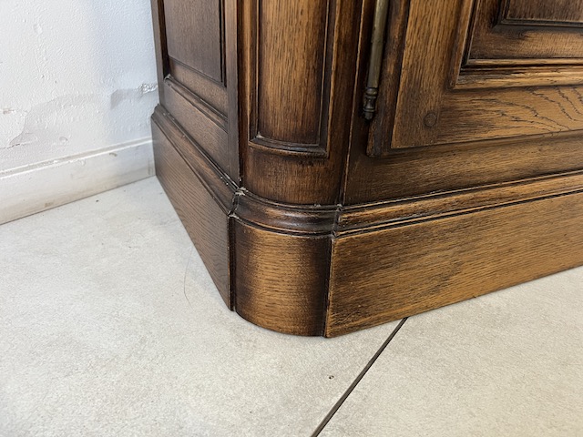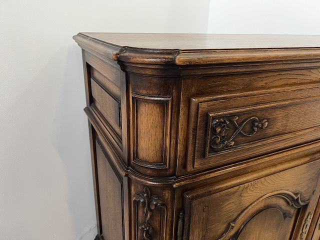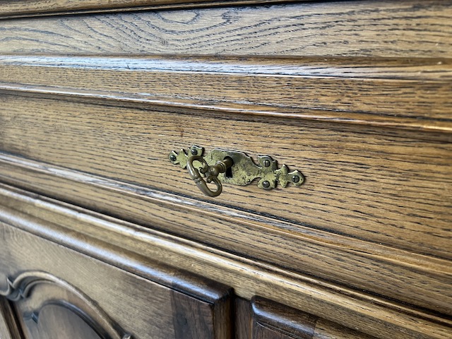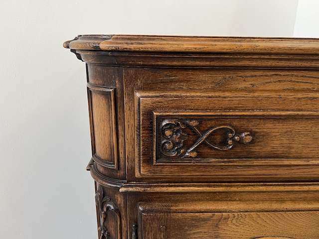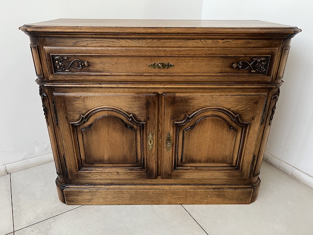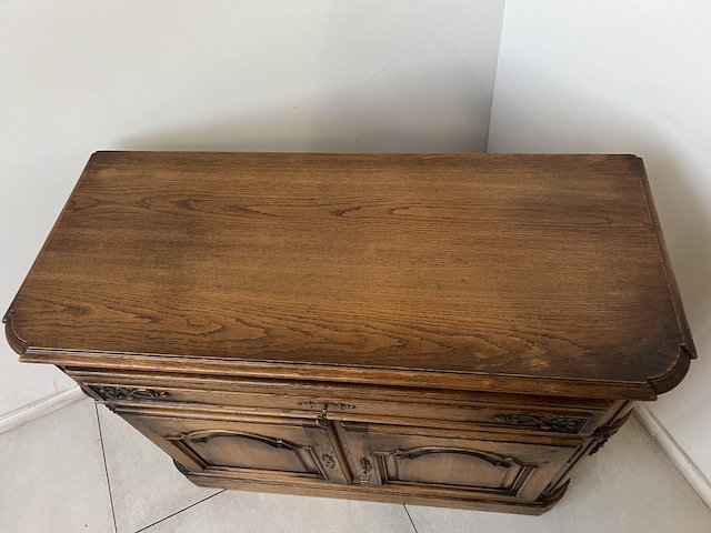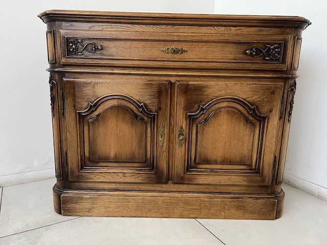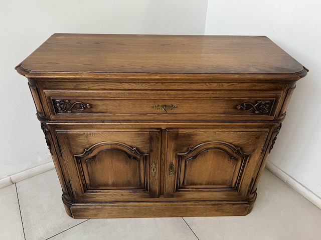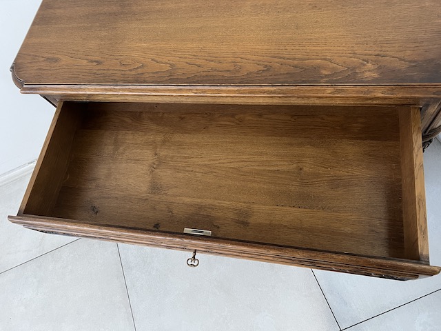 Komoda dębowa. Wykonana jest w belgijskiej manufakturze stolarskiej Lefevre. Jest to firma rodzinna, która istnieje nadal od czterech pokoleń. Efektowna. Jest w dobrym stanie, zadbana. Nie ma żadnych uszkodzeń ani ubytków. Jest solidnie wykonana i ciężka. Nosi typowe ślady użytkowania. Zamki są sprawne z kompletem kluczy. Jest gotowa do wstawienia.