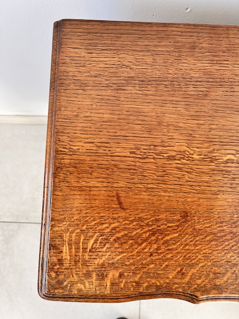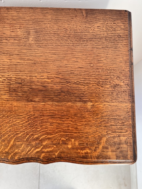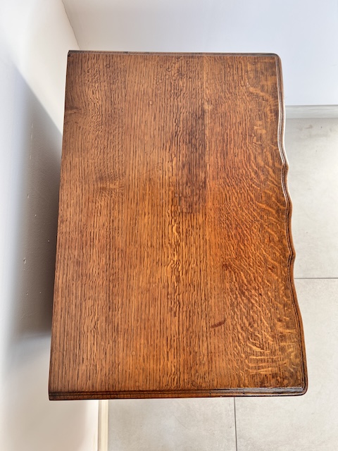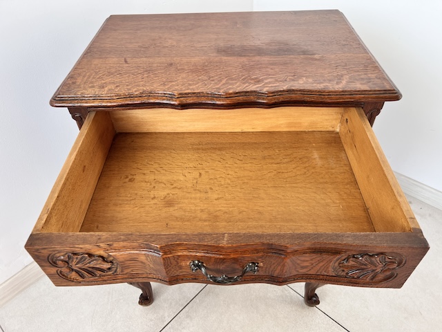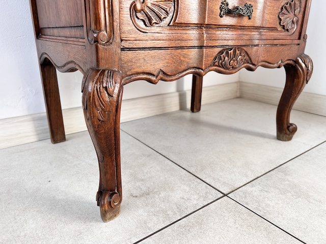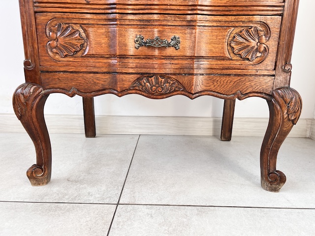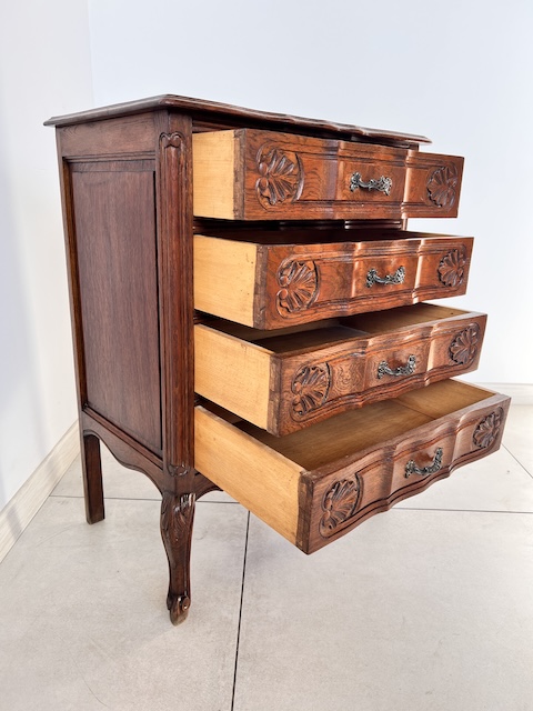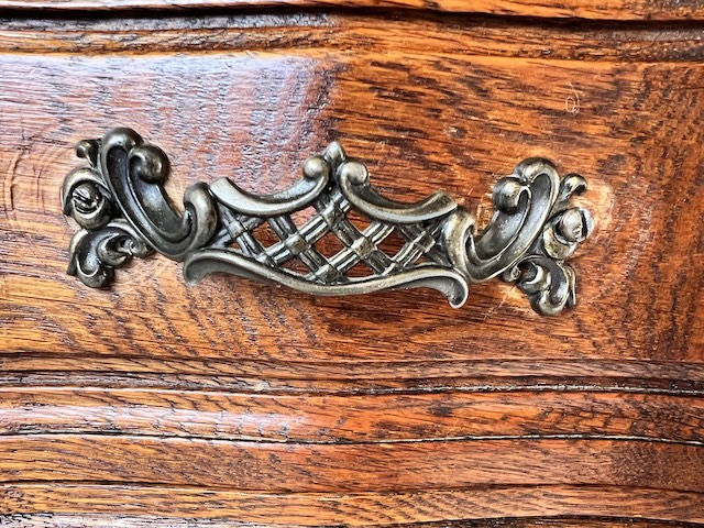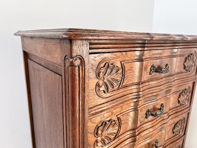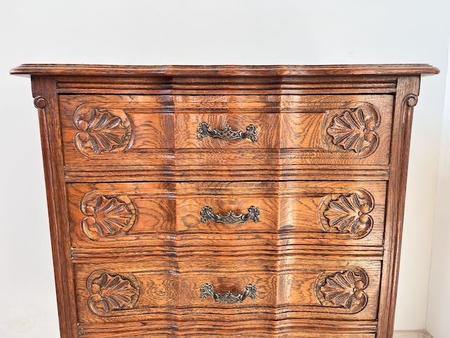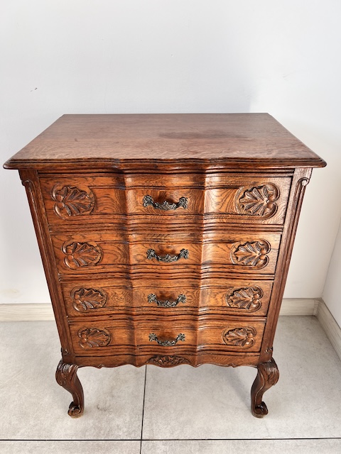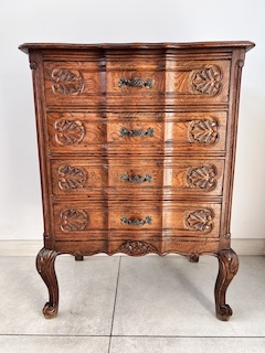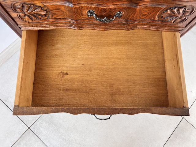 Komoda z szufladami, słupek. Wykonana jest z drewna dębowego w stylu ludwikowskim. Bardzo ładna, bogato zdobiona. Blat i fronty szuflad mają nieregularne kształty. Jest generalnie w dobrym stanie. Blat nie jest idealny. Są na nim delikatne przebarwienia. Innych uszkodzeń ani ubytków nie ma. Nosi typowe ślady użytkowania. Wewnątrz jest zadbana. Komoda jest gotowa do wstawienia.