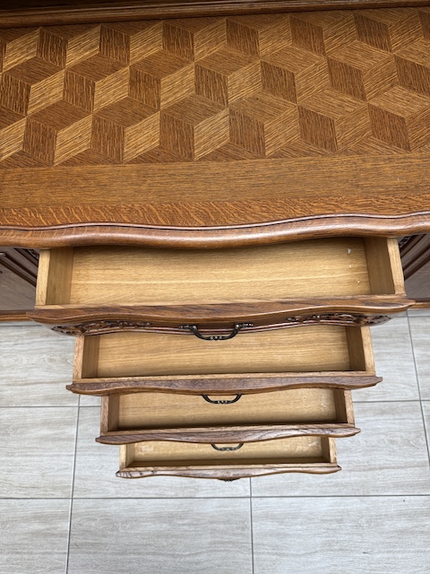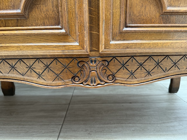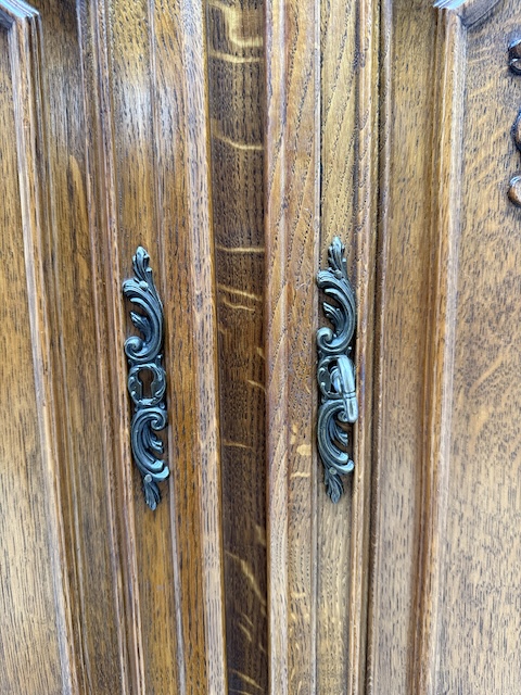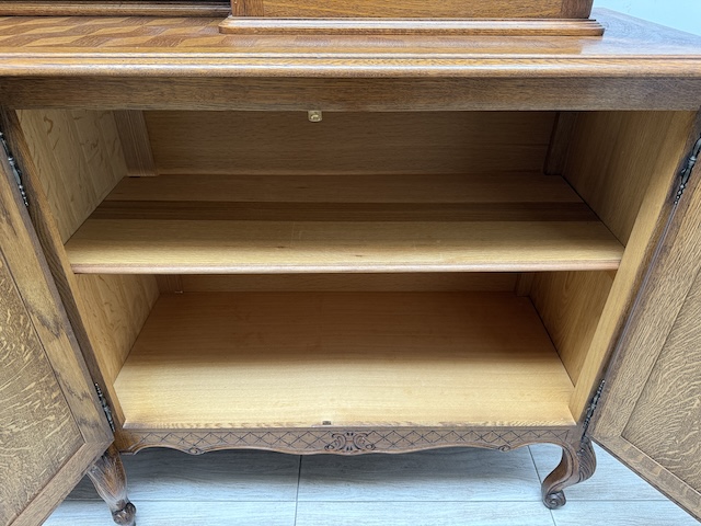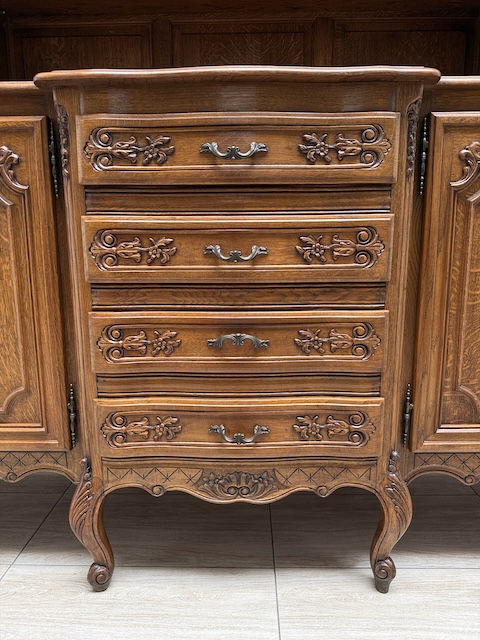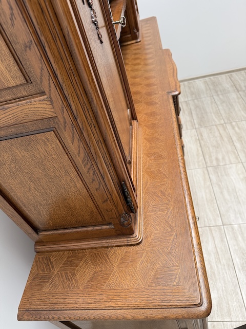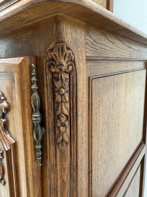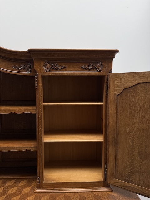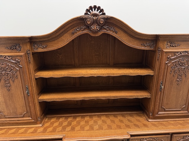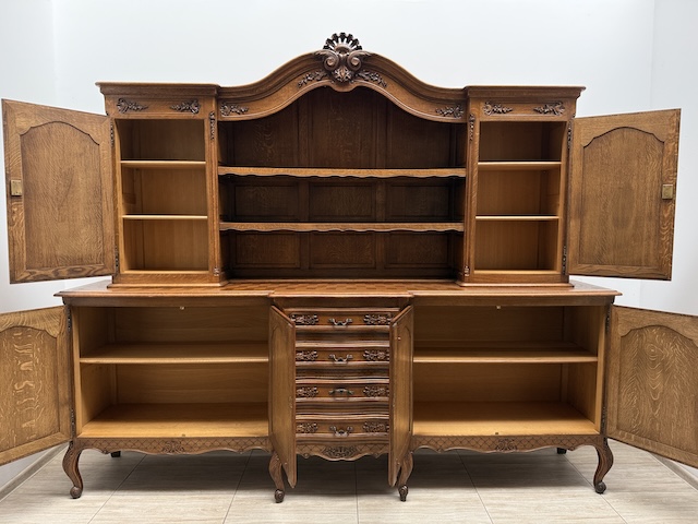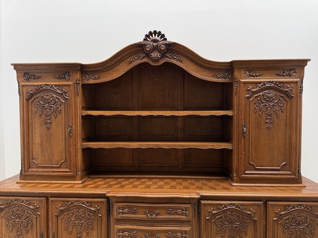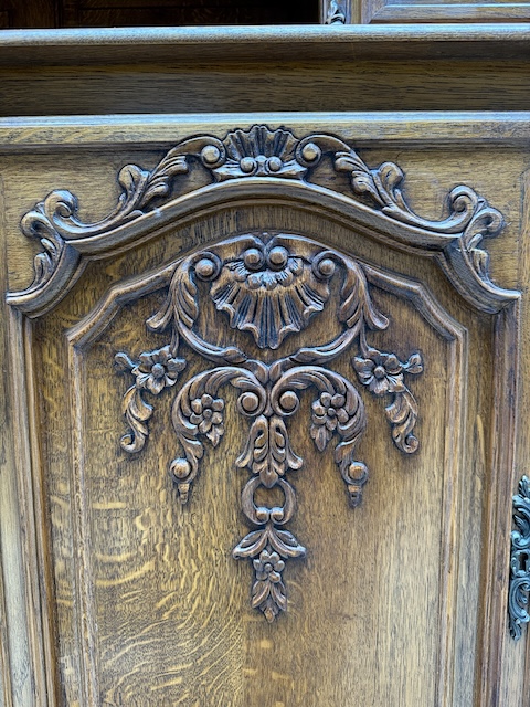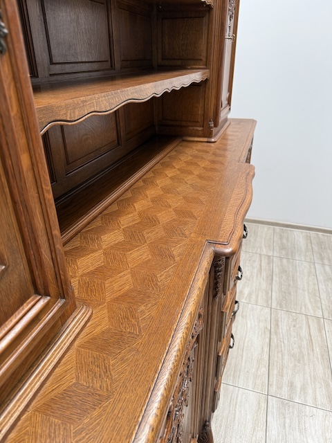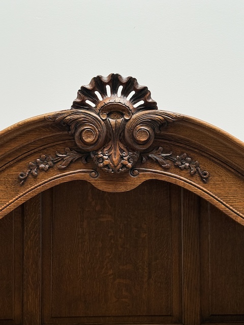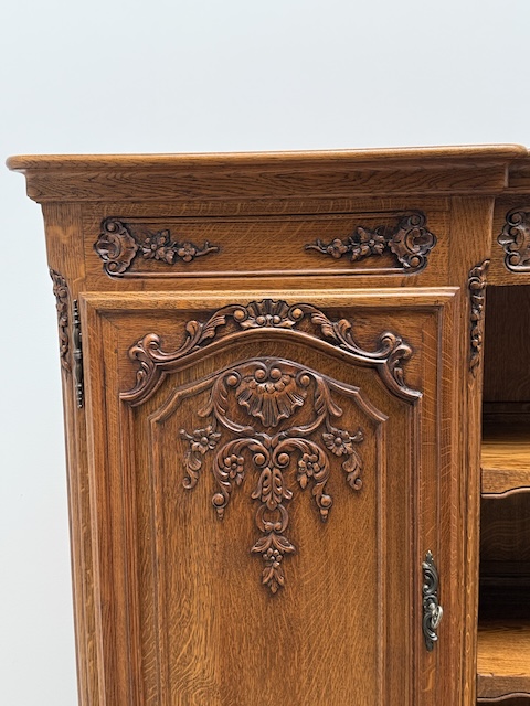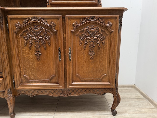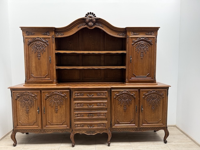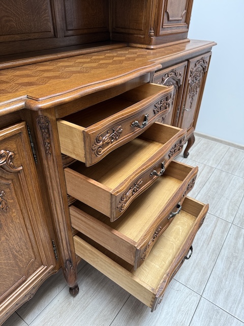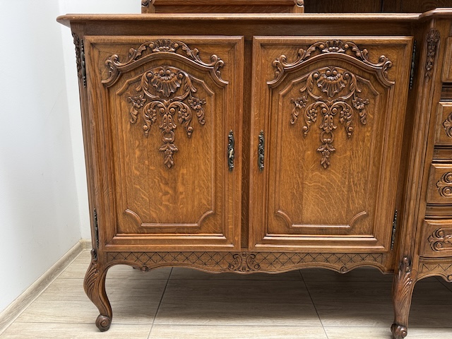 Kredens wykonany z litego drewna dębowego. Mebel wyróżnia się bogatymi rzeźbieniami – kwiatowe ornamenty zdobią fronty szafek, szuflady oraz zwieńczenie. Górna część z otwartymi półkami i dwiema zamykanymi szafkami doskonale sprawdzi się do wyeksponowania porcelany czy szkła. Dolna część wyposażona jest w cztery pojemne szafki oraz sześć szuflad, co zapewnia dużą funkcjonalność i miejsce do przechowywania.
