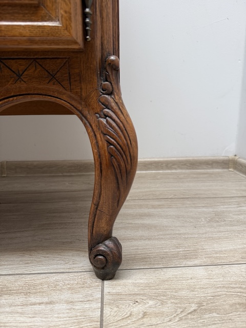 Mebel stoi na stylizowanych, kabriolowych nóżkach, a całość zdobi elegancka korona z centralnym motywem dekoracyjnym. Kredens zachowany w bardzo dobrym stanie, stabilny i solidny, gotowy do wstawienia do wnętrza.