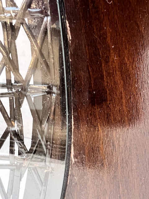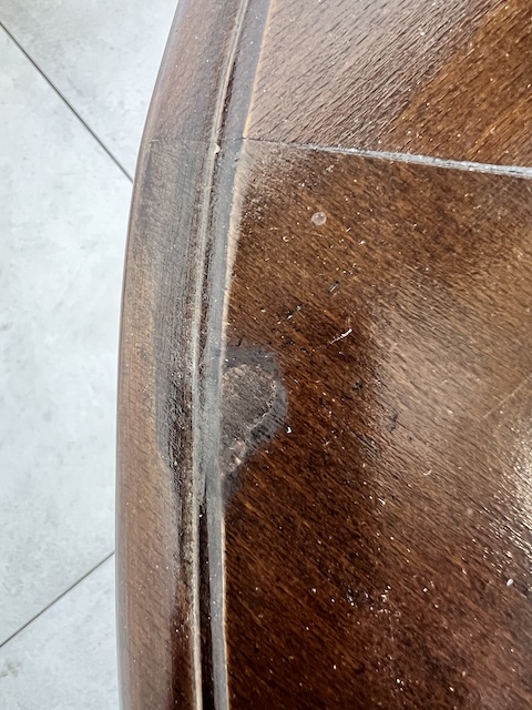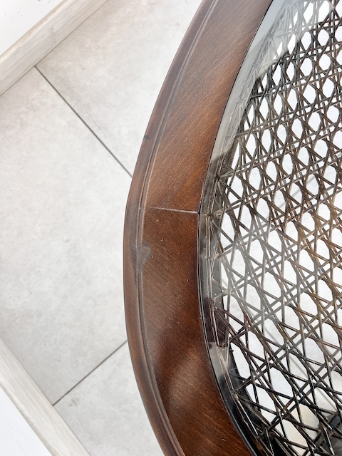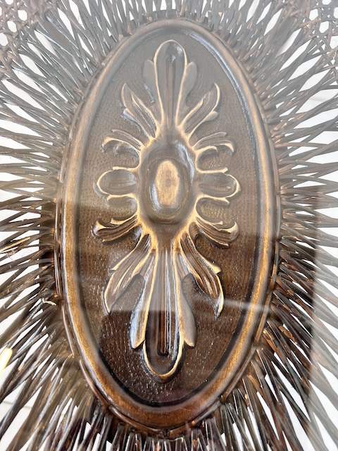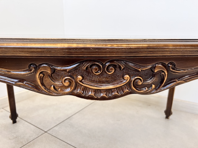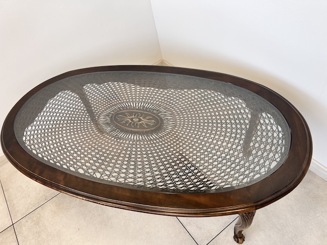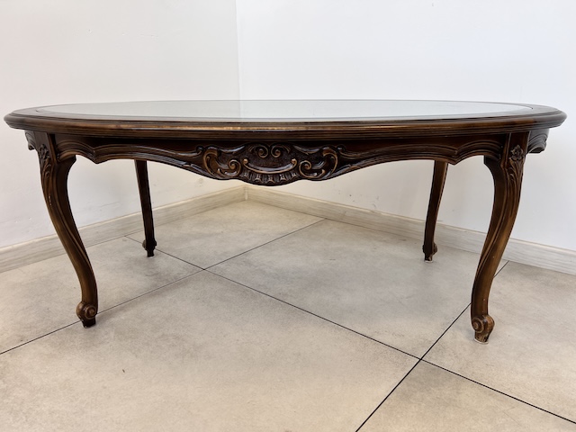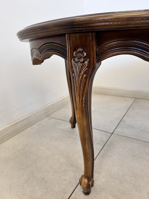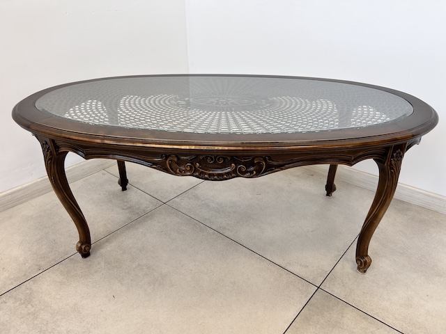 Dębowa ława. Wykonana jest w stylu ludwikowskim. Owalny blat jest wykonany z rafii i osłonięty fazowaną szybą. Ława jest efektowna, ładnie zdobiona. Jest w dobrym stanie. Na rancie blatu są niewielkie otarcia. Nie ma innych uszkodzeń ani ubytków. Jest stabilna, gotowa do wstawienia.