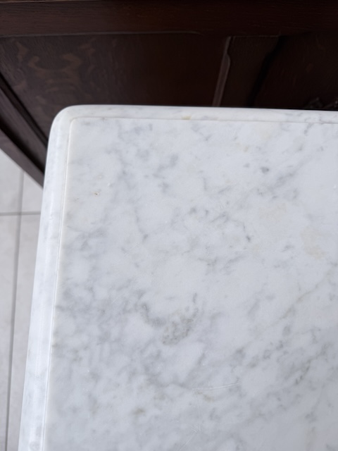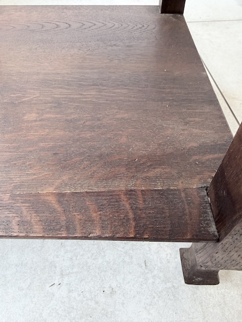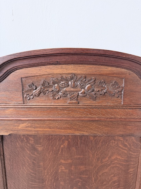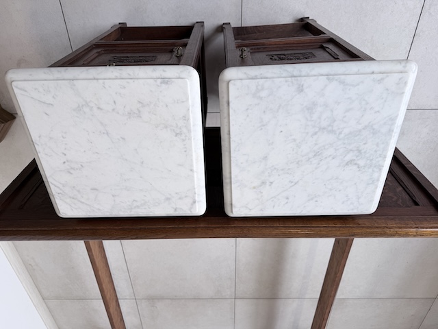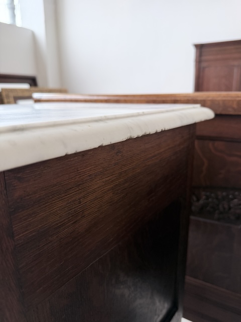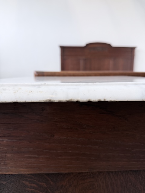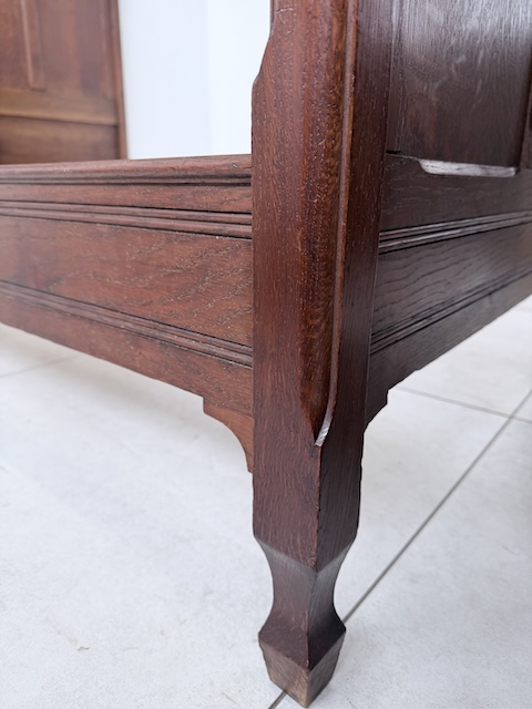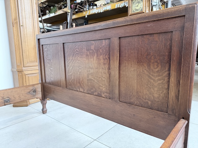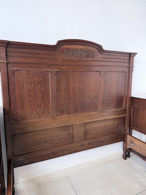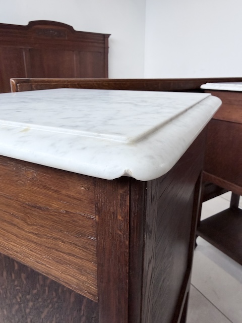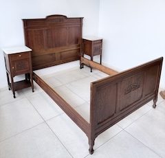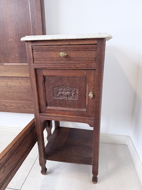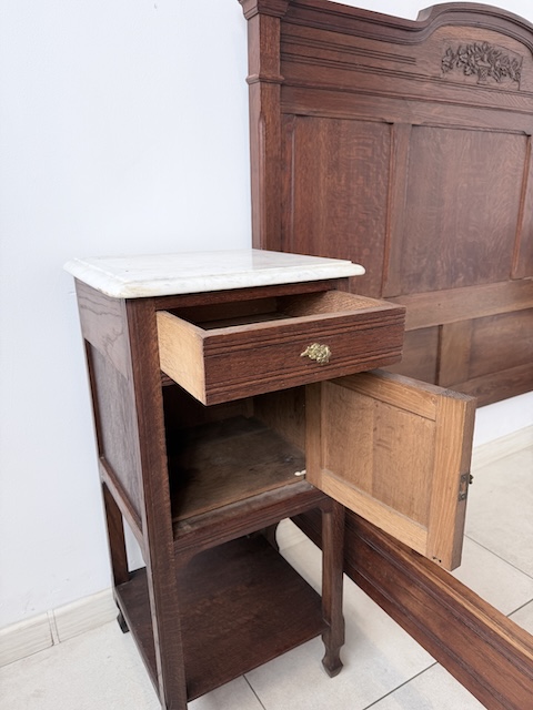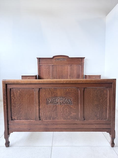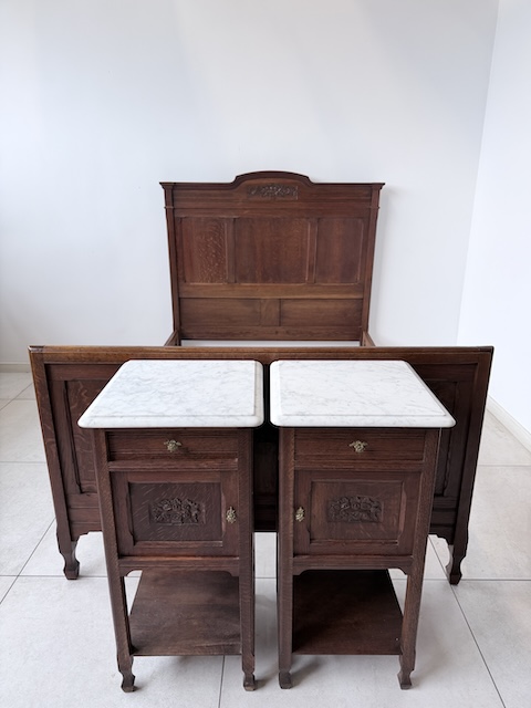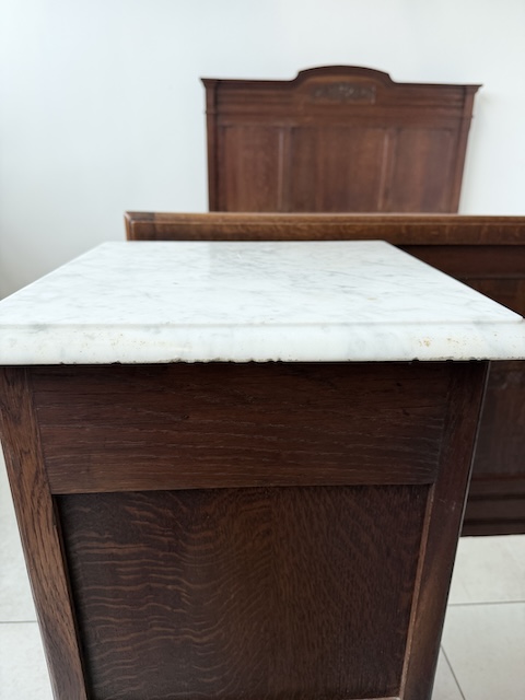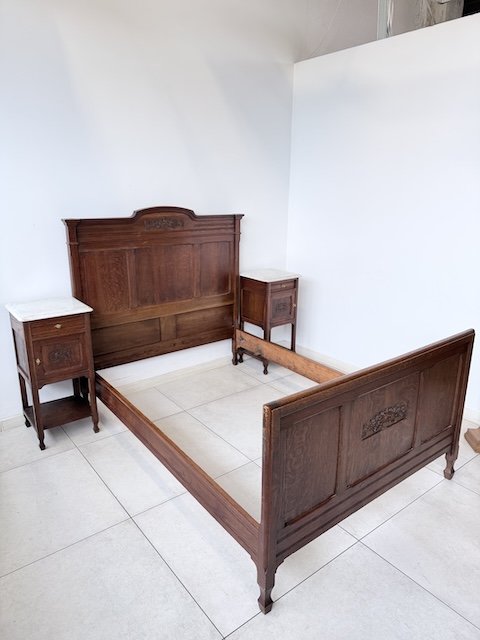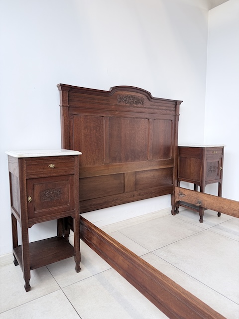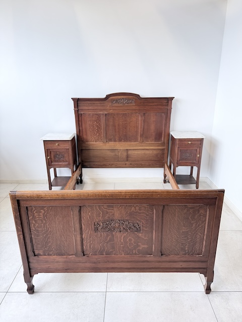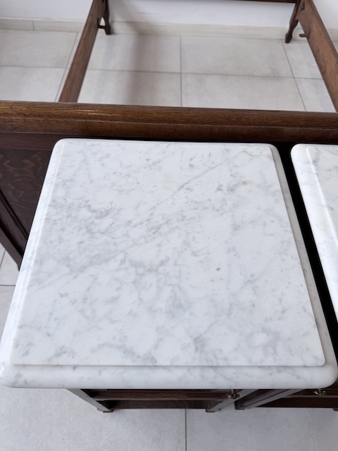Łóżko ze stolikami. Wykonane są z drewna dębowego w stylu secesyjnym w 1931 roku. Efektowne. Noszą typowe ślady użytkowania. Blaty na stolikach są marmurowe. Ranty od dołu są nierówne, jeden narożnik jest wyszczerbiony. Ich stan szczegółowo pokazany jest na zdjęciach. POtrzebny jest stelaż i materac o wymiarach zbliżonych do wewnętrznego wymiaru ramy np. 195 x 130 cm. Zestaw gotowy jest do wstawienia.