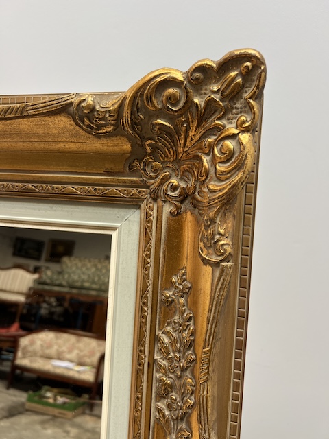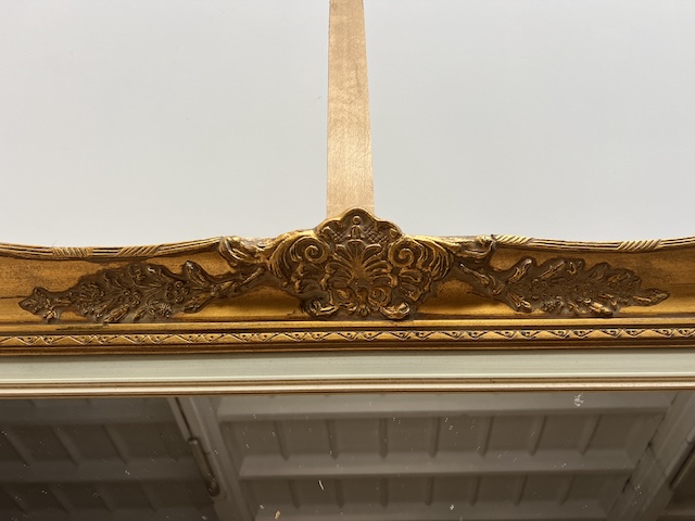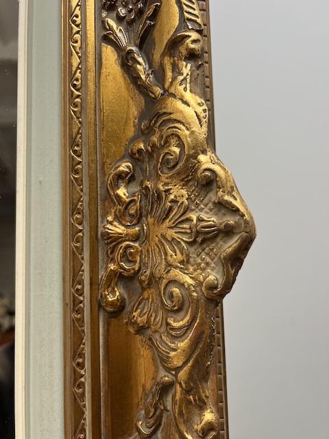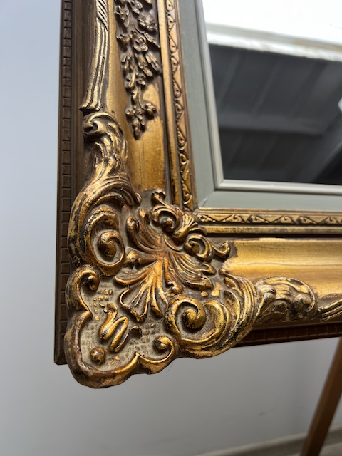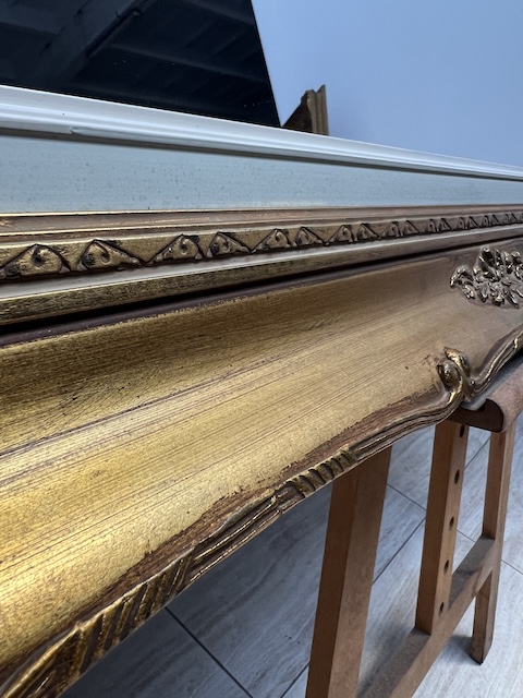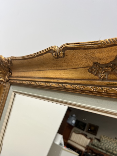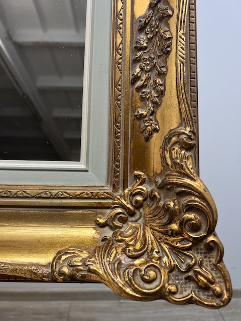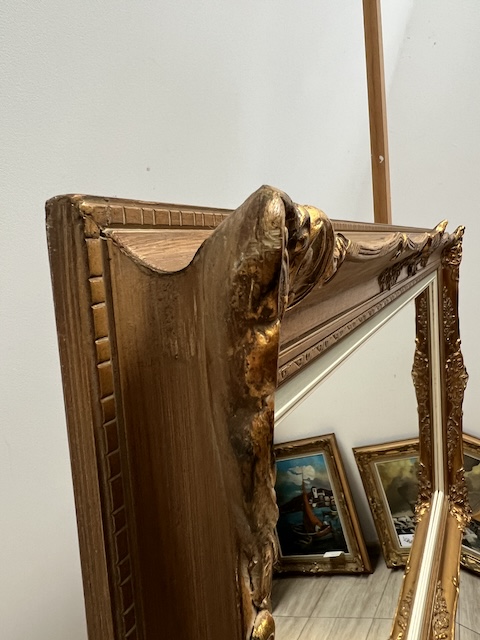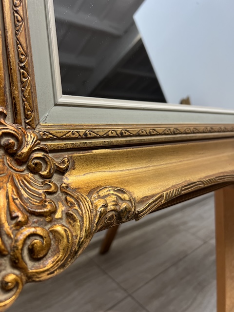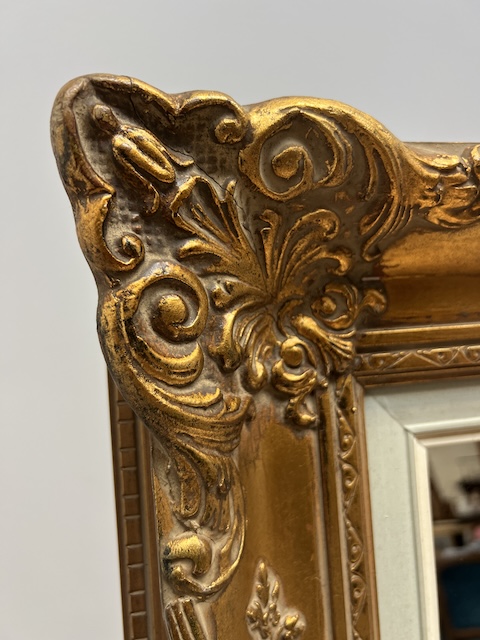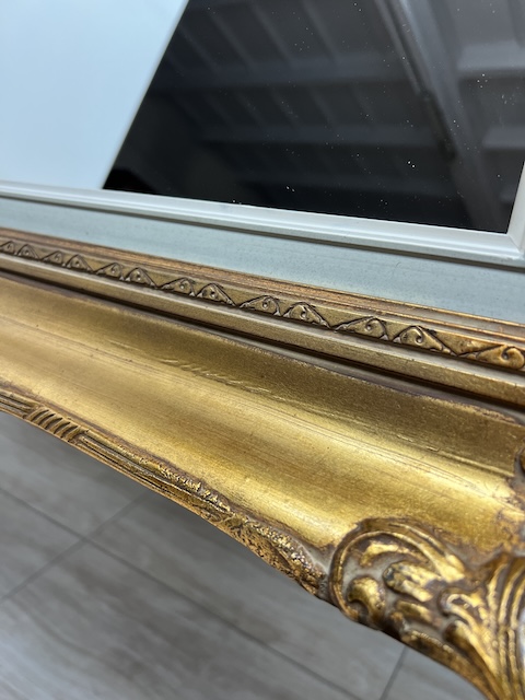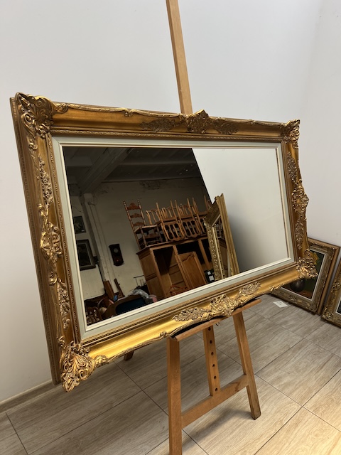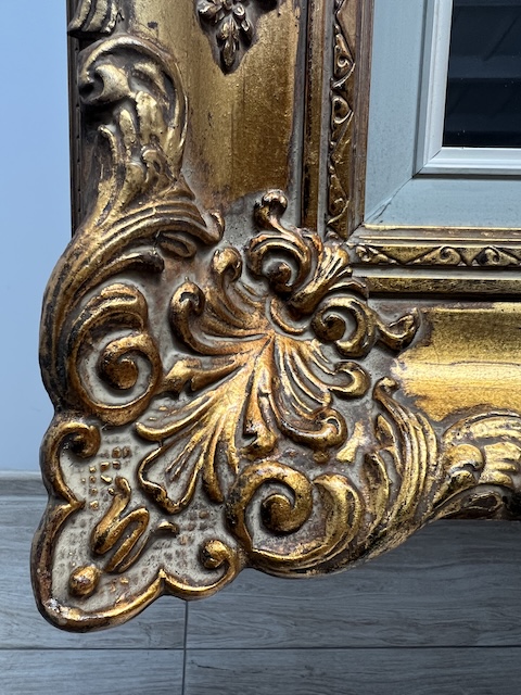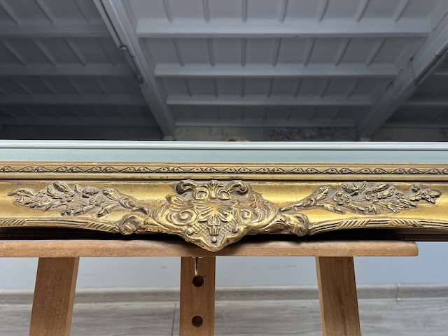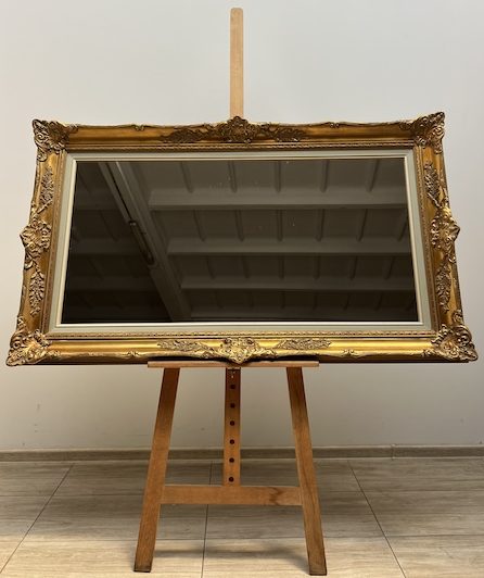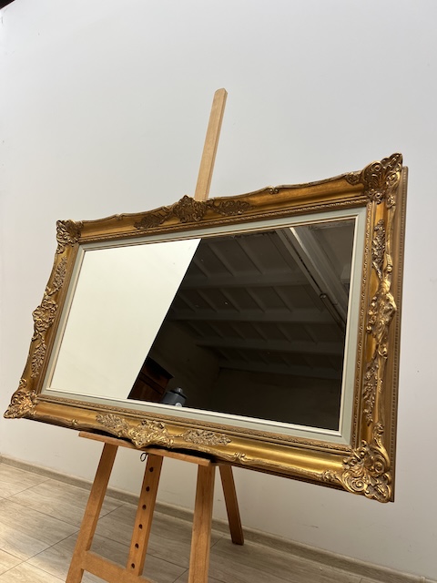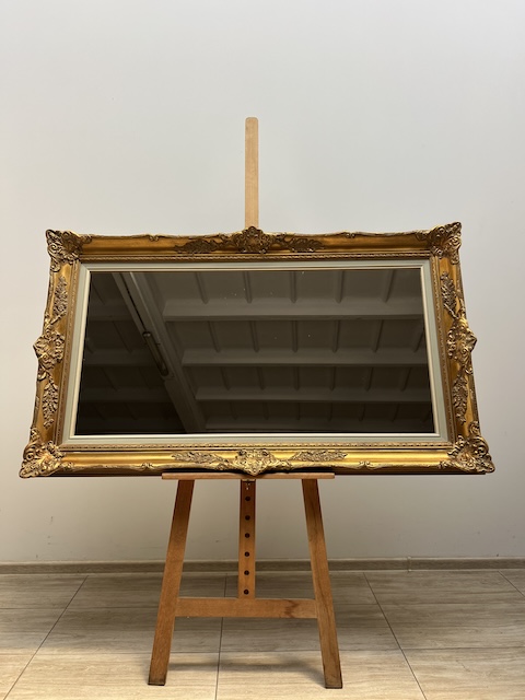 Lustro stylowe. Efektowne. Oprawione jest w piękną złotą ramę w stylu barokowym. Rama jest drewniana a zdobienia wykonane z masy ramiarskiej. Jej stan szczegółowo pokazany jest na zdjęciach. Tafla lustra jest nowa. Gotowe jest do zawieszenia.