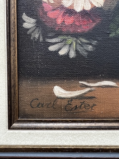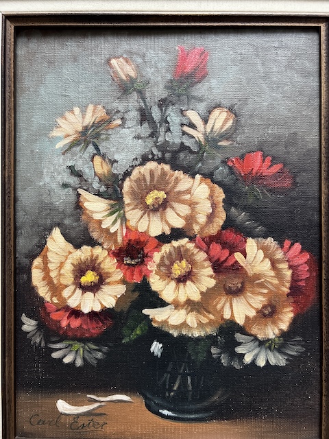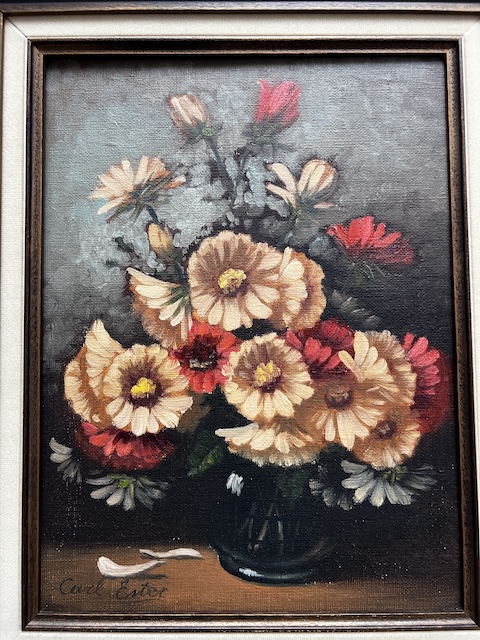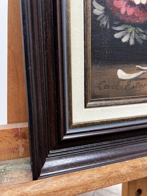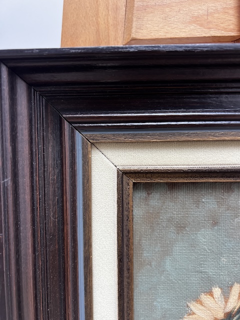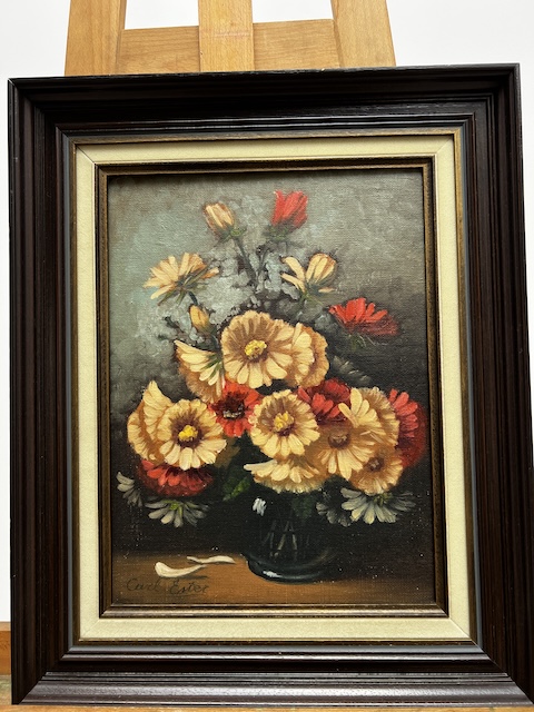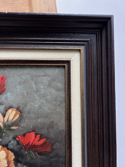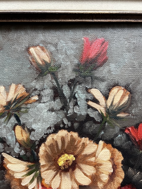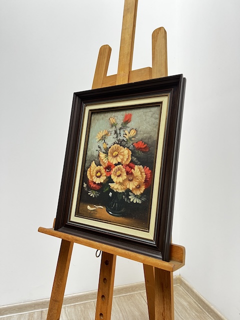 Obraz malowany na płótnie. Piękny bukiet kwiatów w szklanym wazonie. Jest sygnowany. Rama w ciemnym kolorze współgra z płótnem. Obraz idealny do salonu lub jadalni. Gotowy jest do zawieszenia.