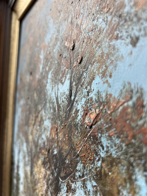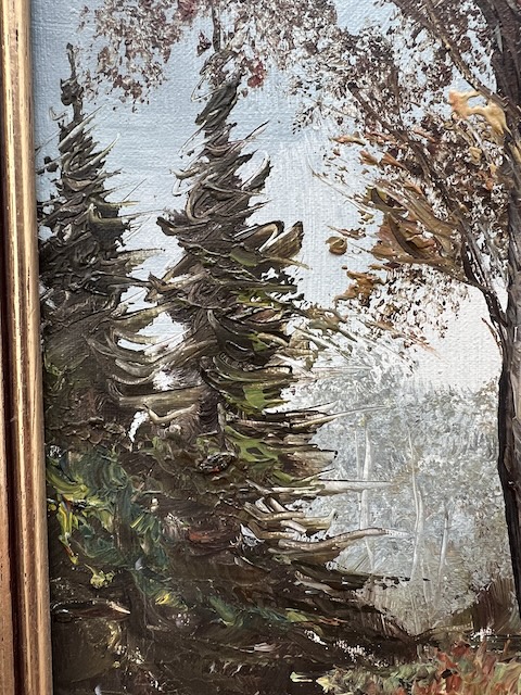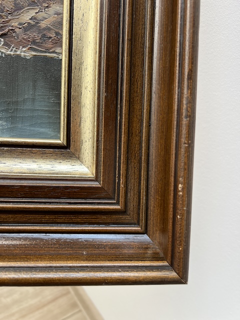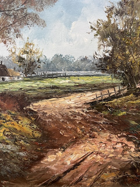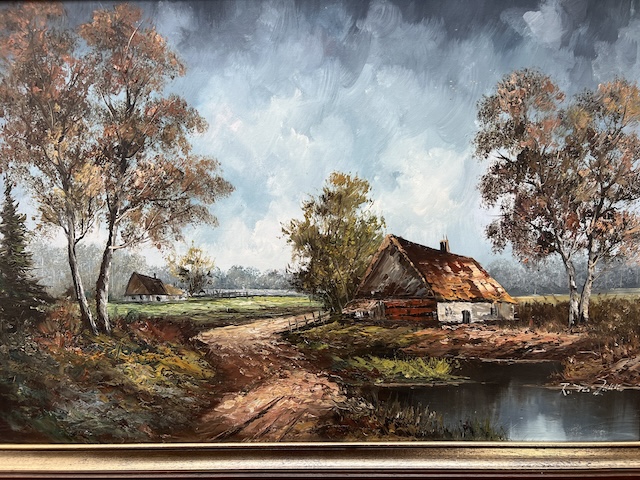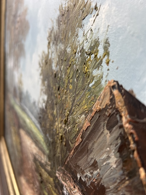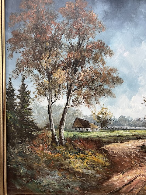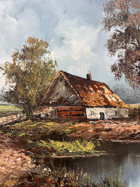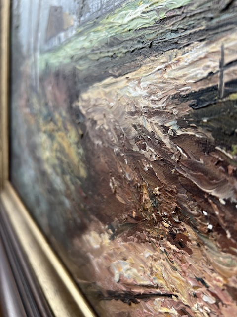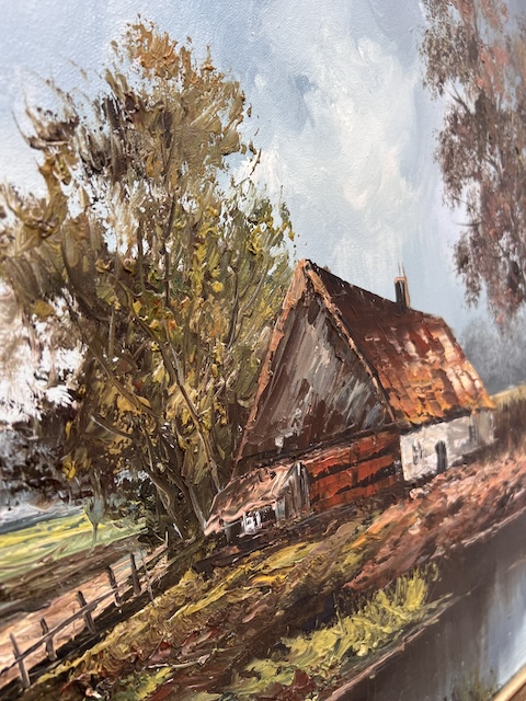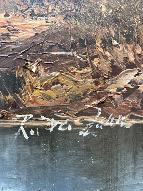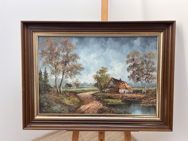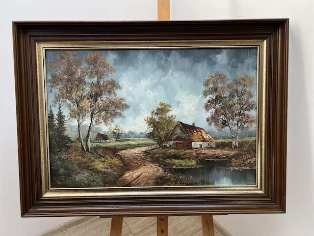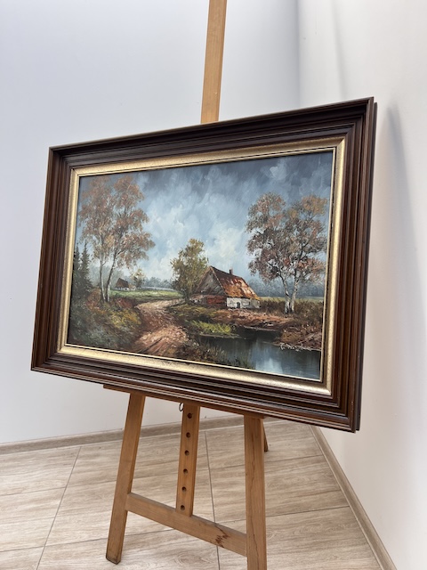 Obraz malowany na płótnie. Piękny, sygnowany pejzaż w drewnianej ramie. Efektowny dodatek do stylowego domu. Obraz gotowy do zawieszenia.