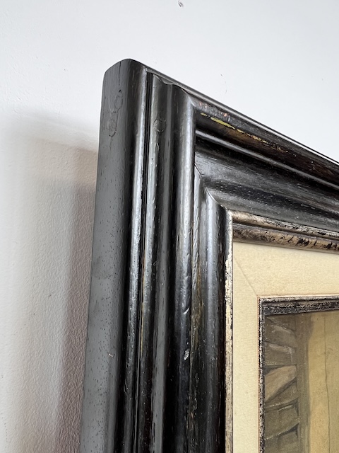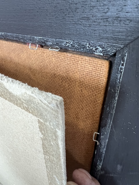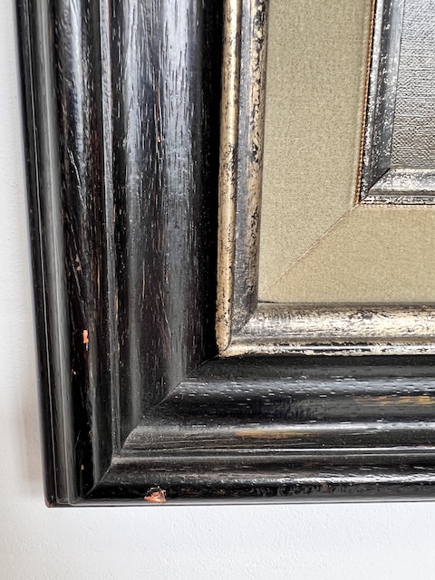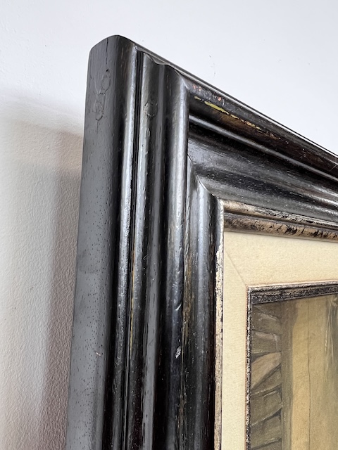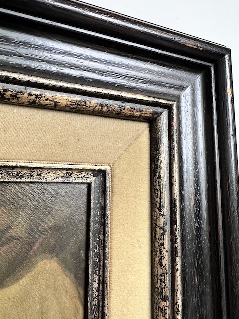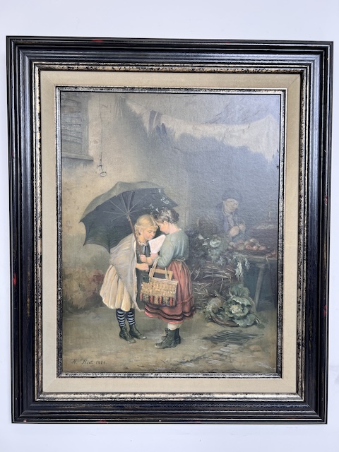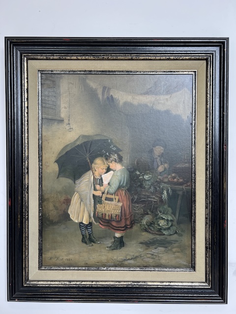 Obraz malowany na płycie pilśniowej. Przedstawia scenkę rodzajową; dwie dziewczynki pod parasolem przy straganie. Obraz oprawiony w efektowną, stylową ramę. Są na niej delikatne przetarcia, które mają utwierdzać widza w przekonaniu, że obraz pochodzi z XIX w. Oczywiście technika wskazuje, że to wiek XX. Obraz jest w dobrym stanie. Gotowy do zawieszenia. Idealnie wpisuje się we wnętrza w stylu vintage, rustykalnym lub klasycznym.