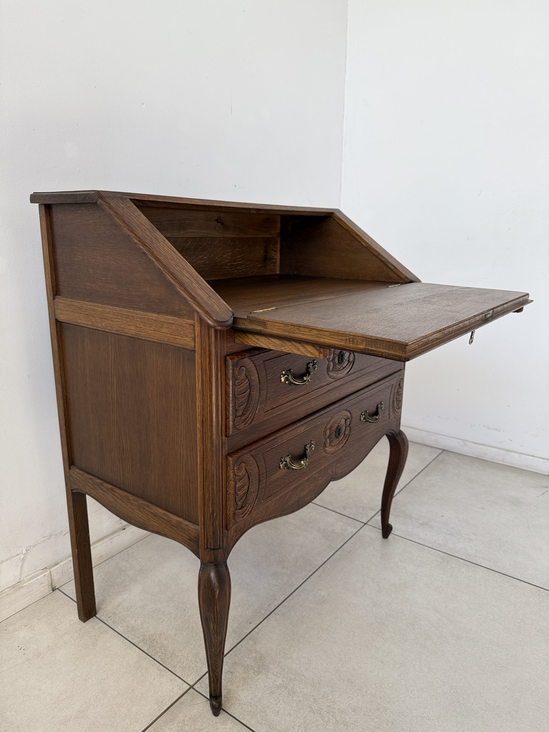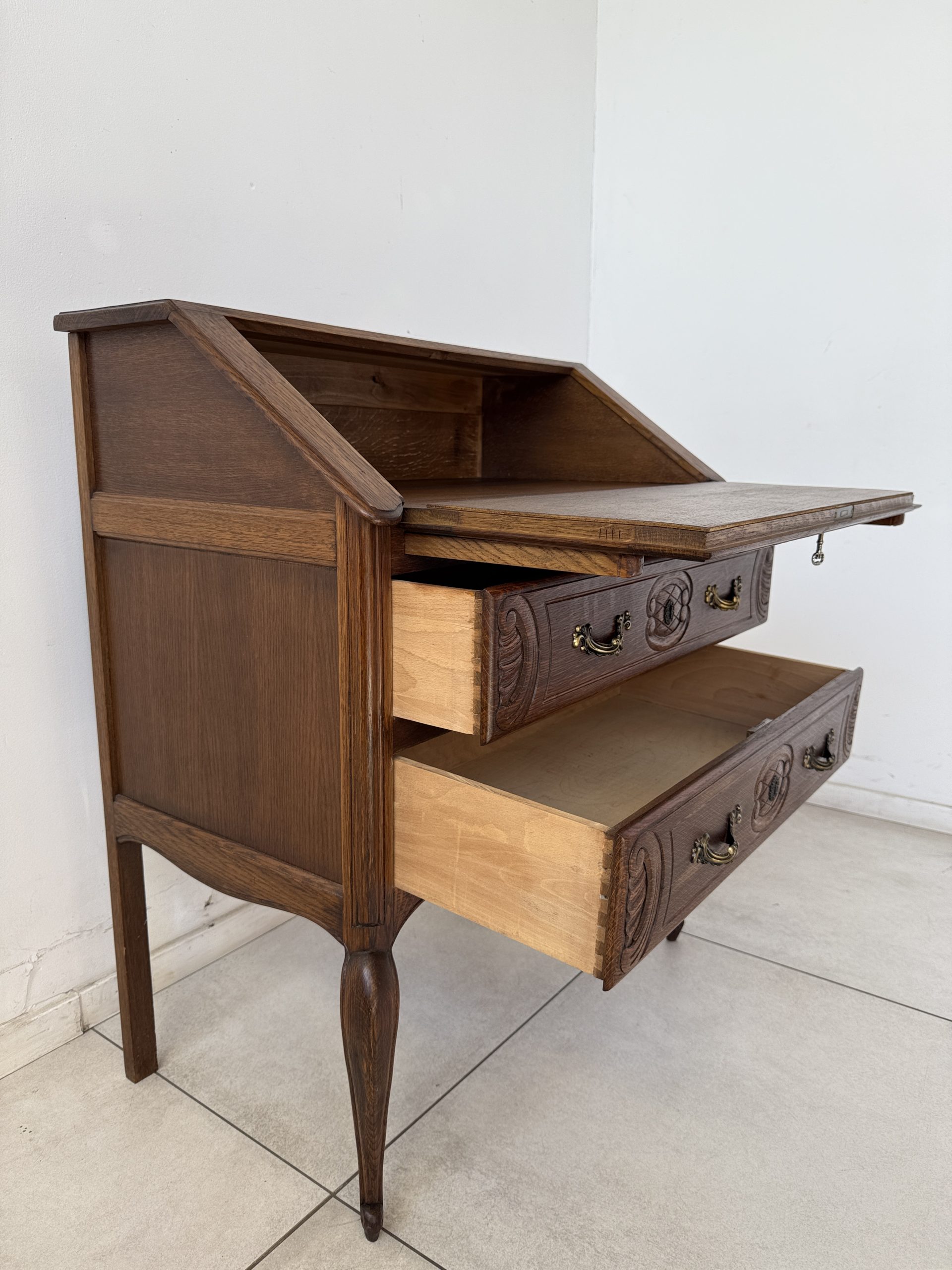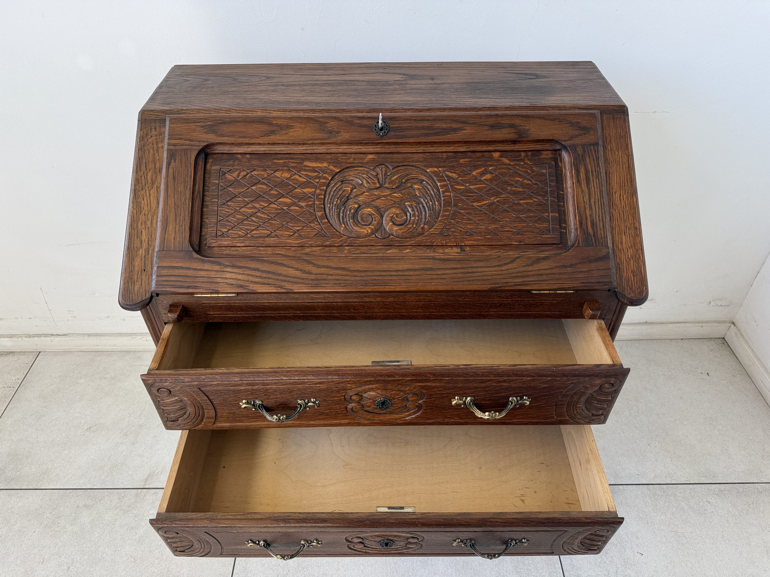 Sekretarzyk wykonany z litego drewna dębowego, ozdobiony misternymi rzeźbieniami na froncie. Mebel posiada opuszczany blat, który po otwarciu tworzy praktyczną przestrzeń do pisania czy pracy. Wnętrze skrywa miejsce na dokumenty, a poniżej znajdują się dwie pojemne szuflady z dekoracyjnymi, mosiężnymi uchwytami.