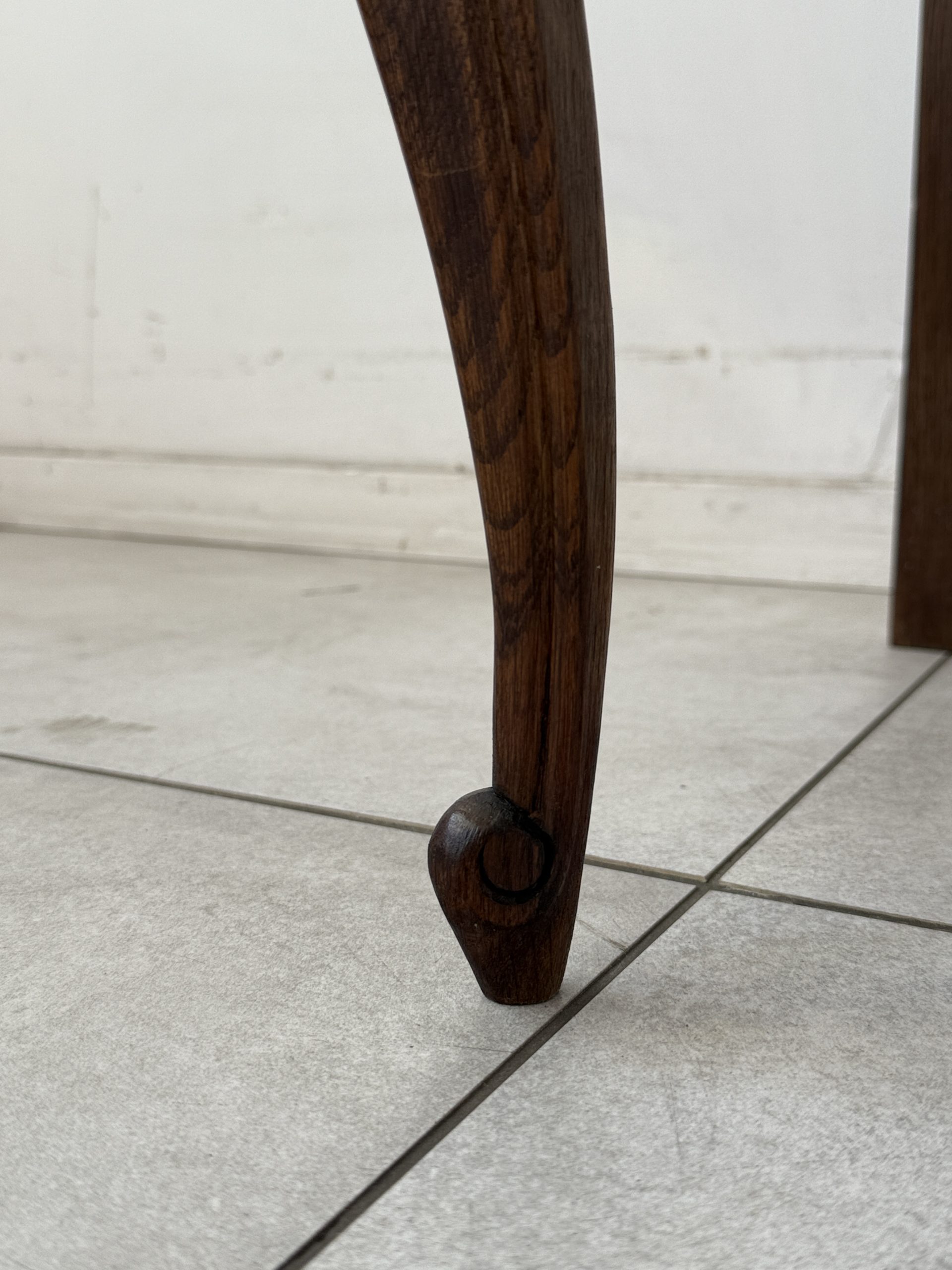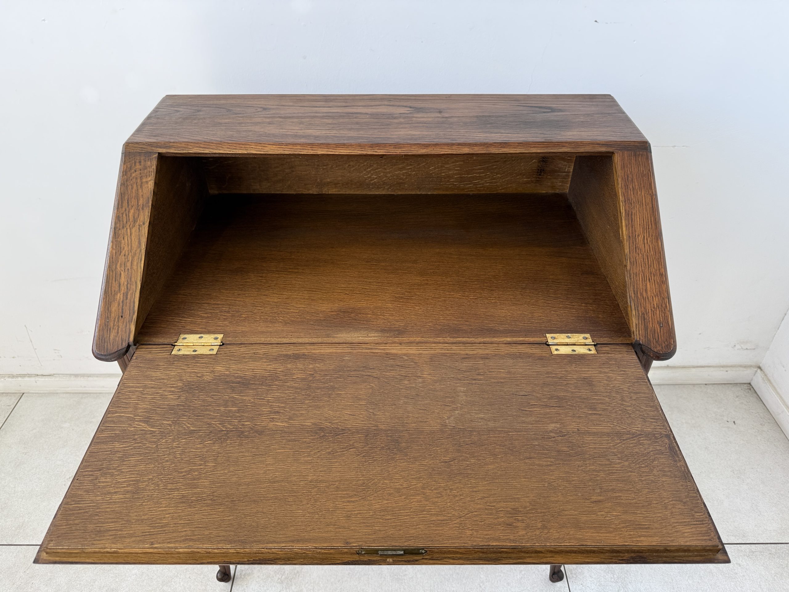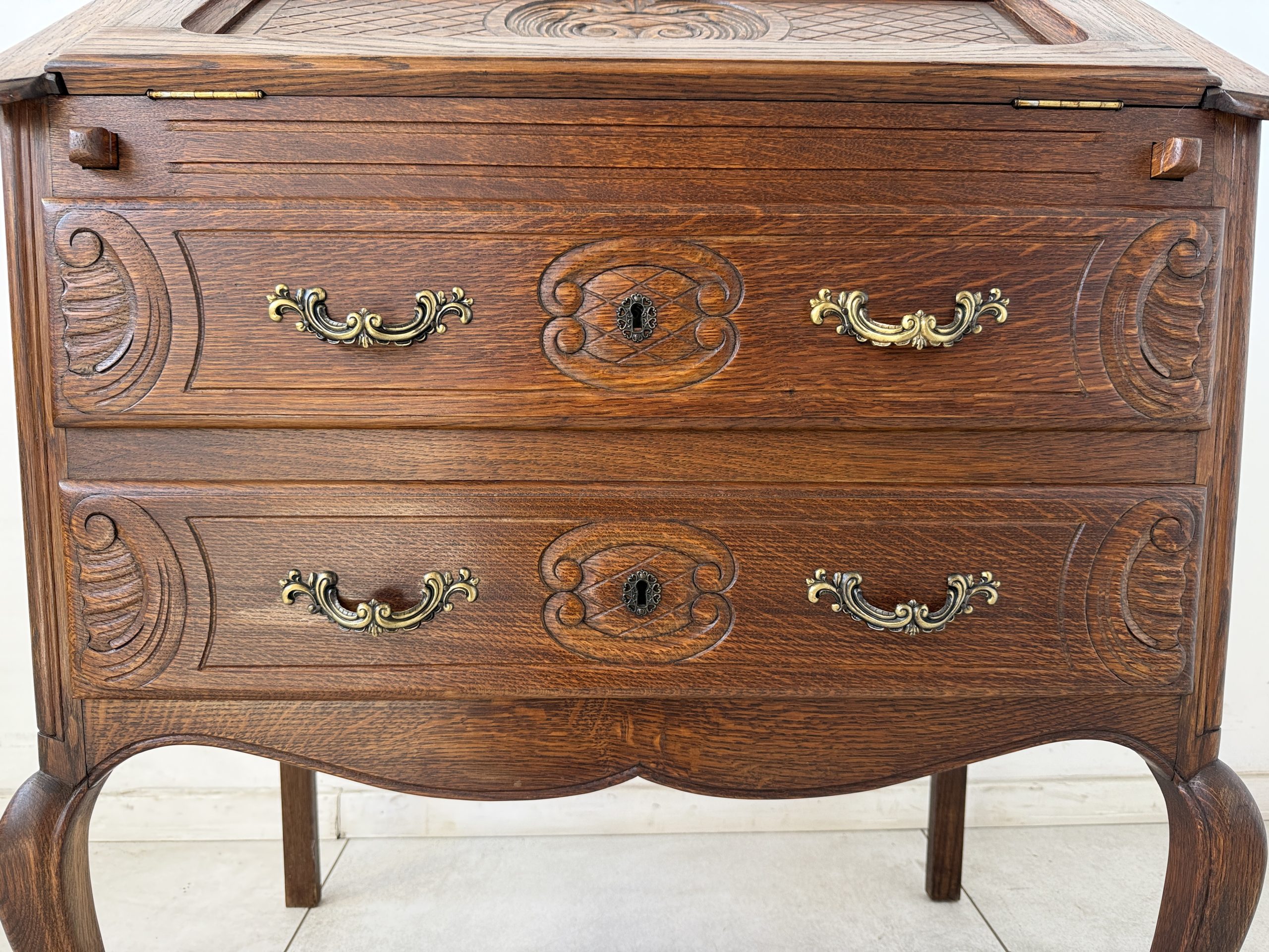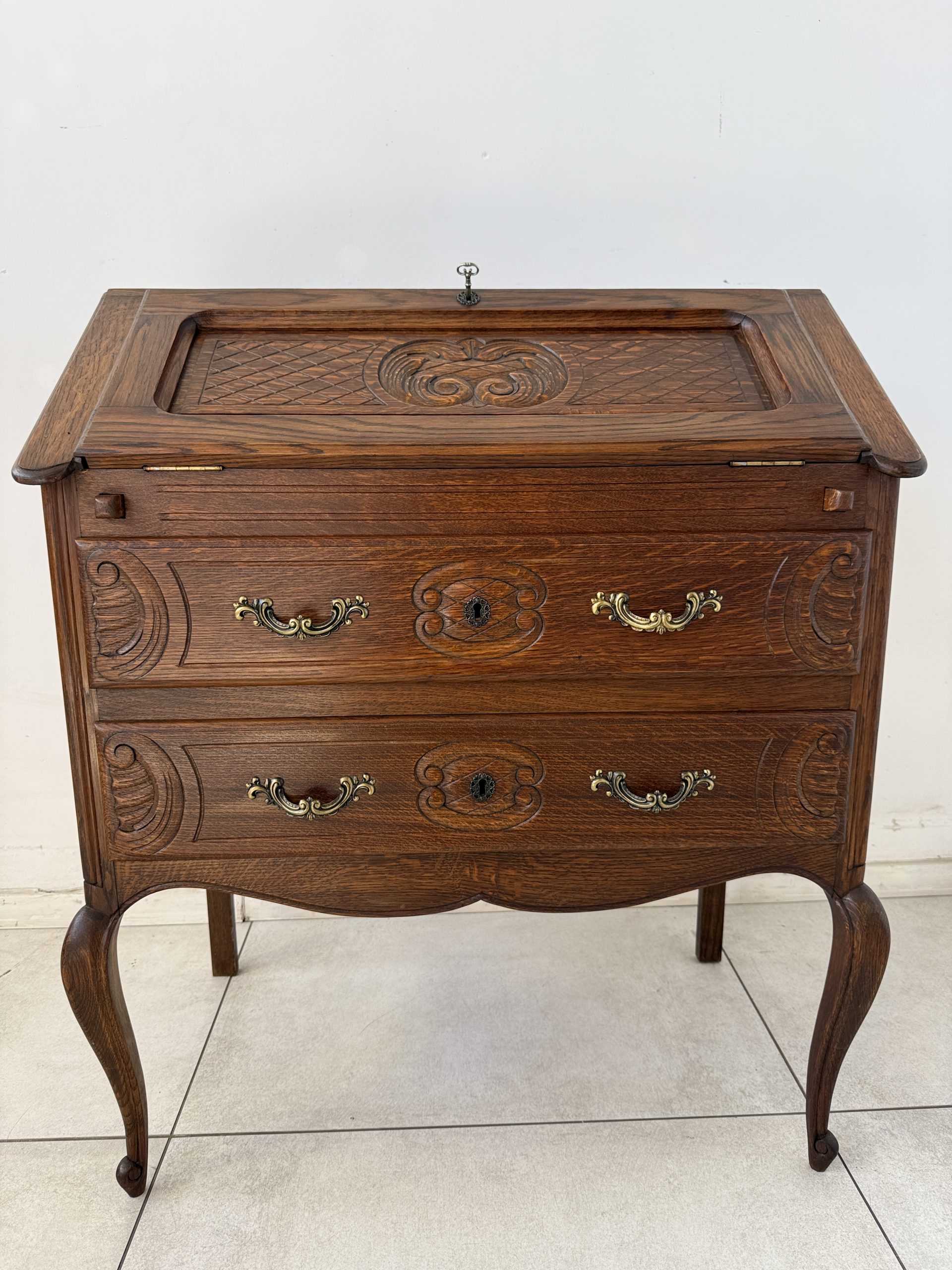 Sekretarzyk wykonany z litego drewna dębowego, ozdobiony misternymi rzeźbieniami na froncie. Mebel posiada opuszczany blat, który po otwarciu tworzy praktyczną przestrzeń do pisania czy pracy. Wnętrze skrywa miejsce na dokumenty, a poniżej znajdują się dwie pojemne szuflady z dekoracyjnymi, mosiężnymi uchwytami.
