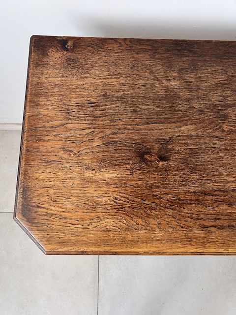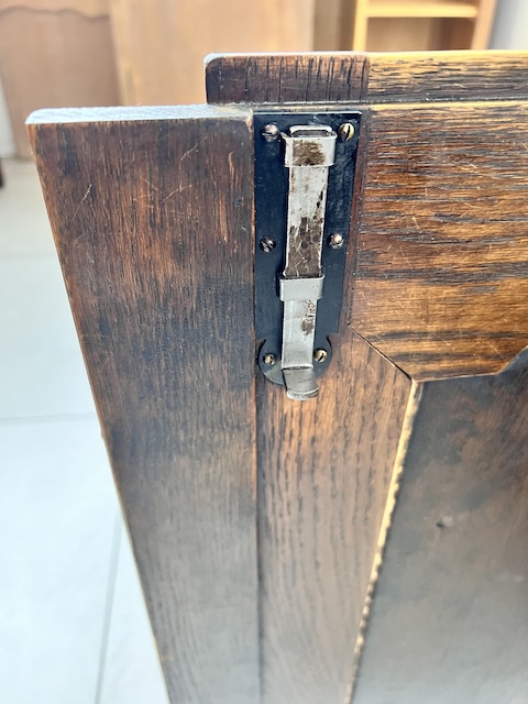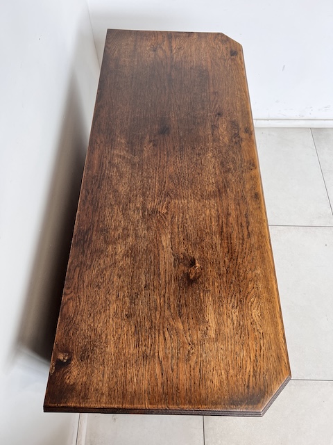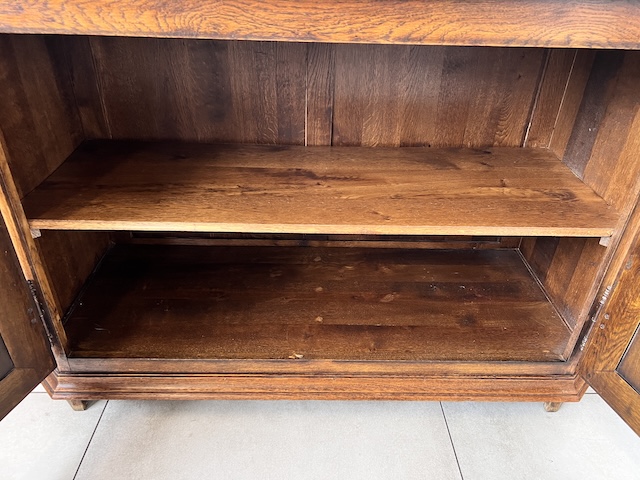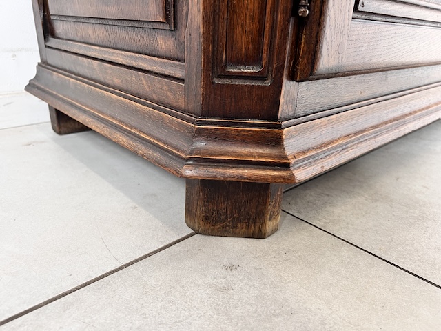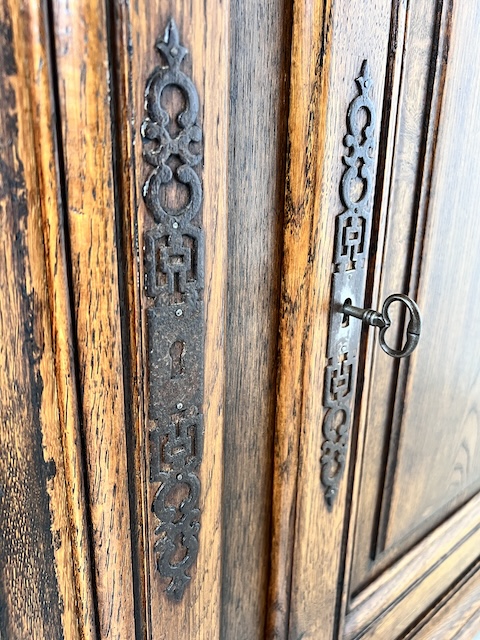 Stylowa komoda dwudrzwiowa wykonana z drewna dębowego. Jest w dobrym stanie. Nie ma żadnych uszkodzeń ani ubytków. Nosi typowe ślady użytkowania. Zamek jest sprawny z kluczem w komplecie. Wewnątrz jest półka. Wnętrze jest również zadbane. Komoda jest gotowa do wstawienia.