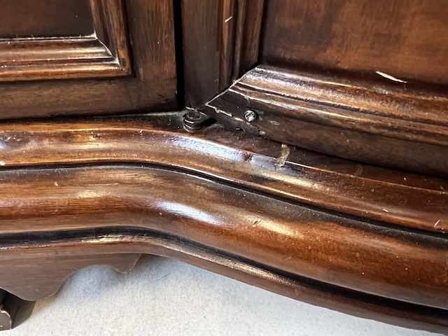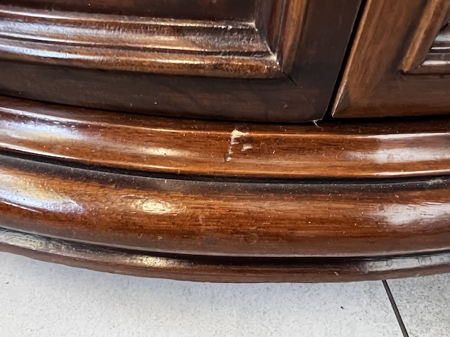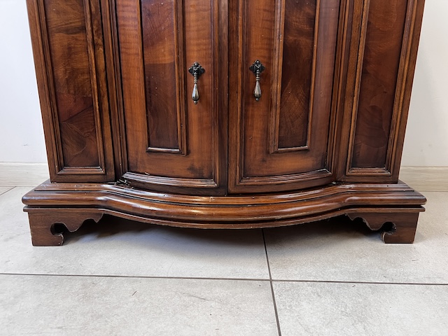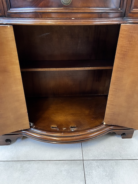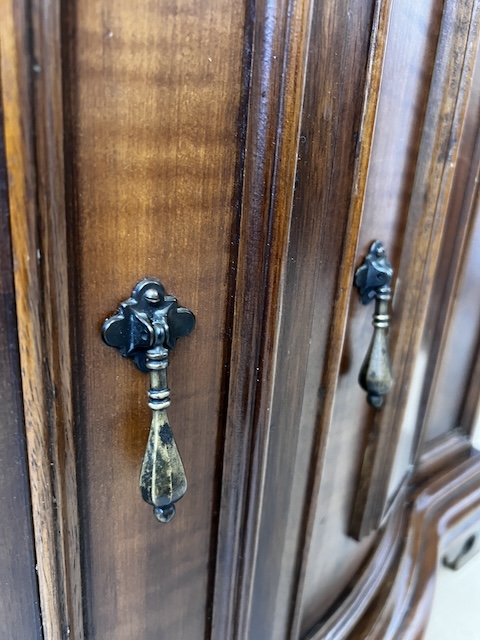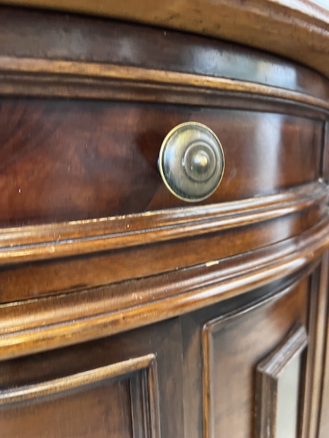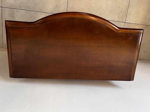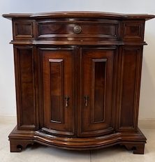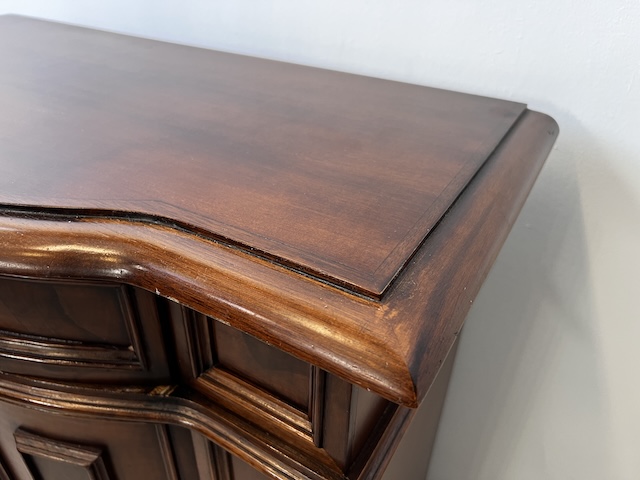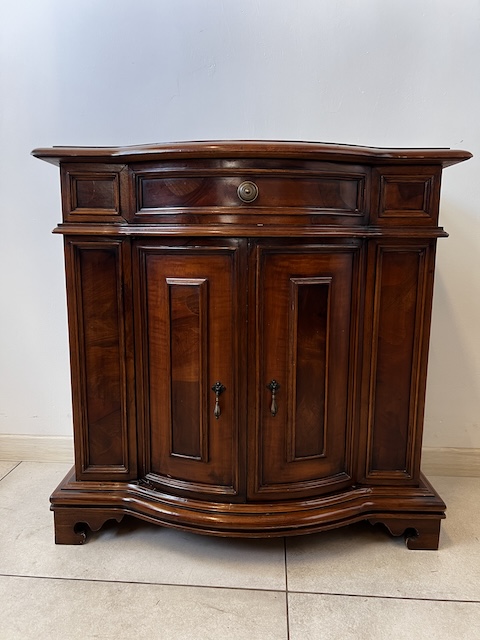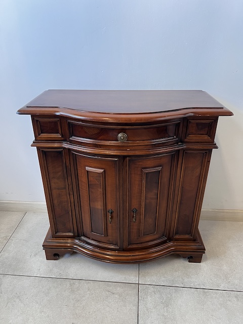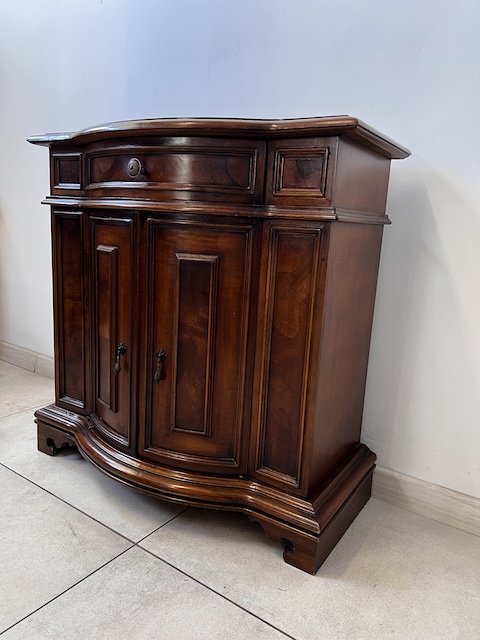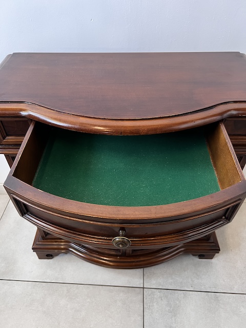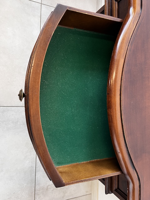 Stylowa komoda. Bardxzo ładna. Ma nieregularny kształt. Pod blatem jest praktyczna szufladka wyłożona zielonym suknem. W szafce jest wąska półka. Komoda jest w dobrym stanie. Nie ma żadnych uszkodzeń ani ubytków. Nosi typowe ślady użytkowania, głównie drobne otarcia. Gotowa jest do wstawienia.