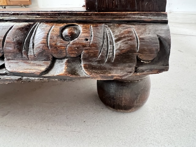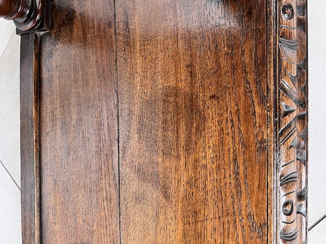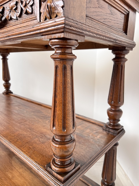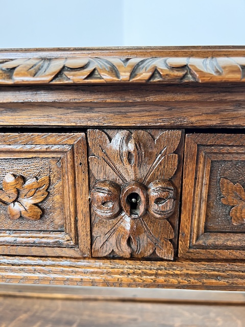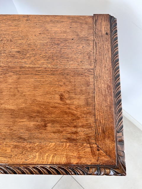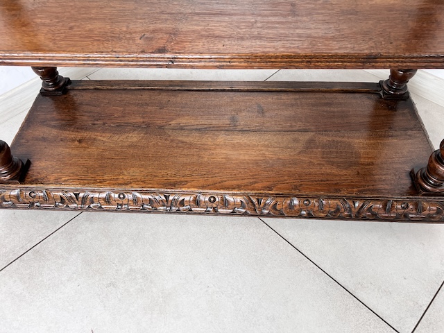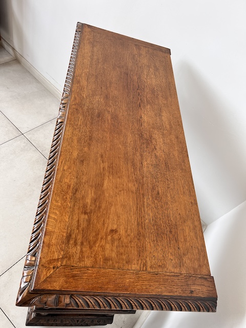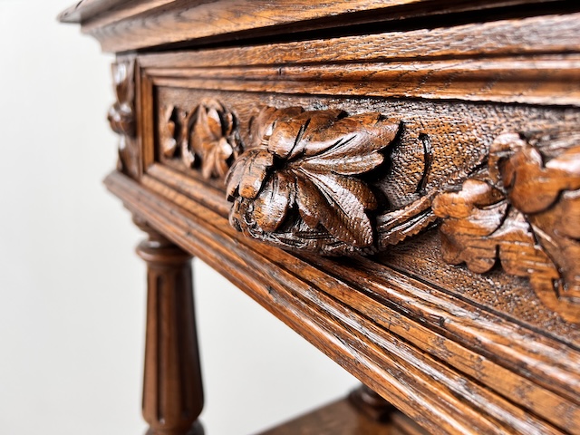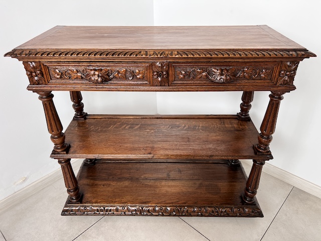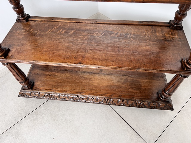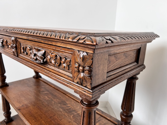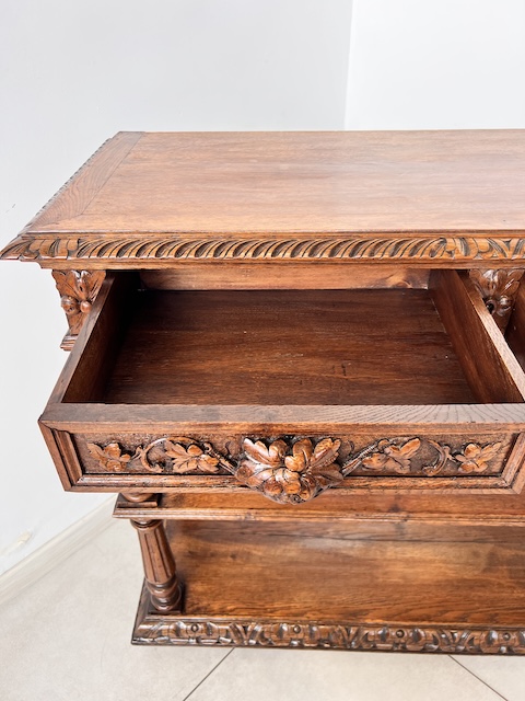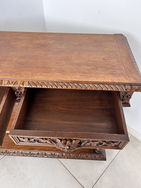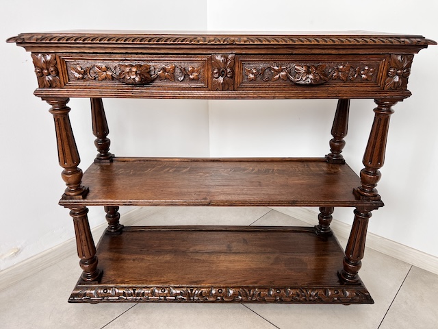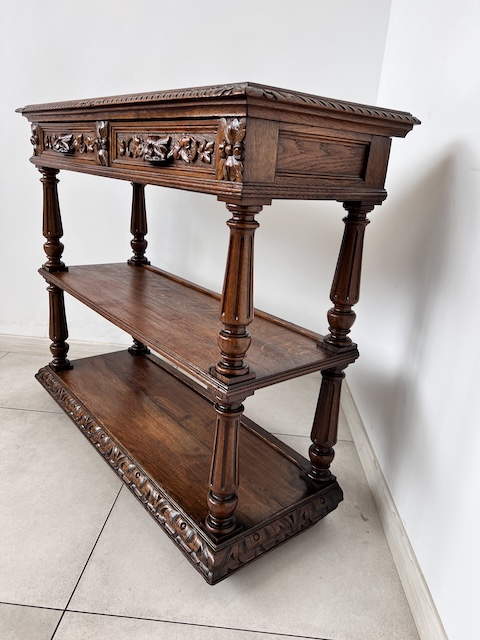 Stylowa konsola wykonana z drewna dębowego. Efektowna; bogato zdobiona motywami roślinnymi. Blat i dolna półka otoczone są rzeźbioną listwą. Pod blatem znajdują się praktyczne dwie szuflady z pieknymi uchwytami. Wewnątrz są czyste i zadbane. Przy dolnej listwie jest niewielki, mało widoczny ubytek. Innych uszkodzeń nie ma. Konsola nosi typowe ślady użytkowania. Gotowa jest do wstawienia.