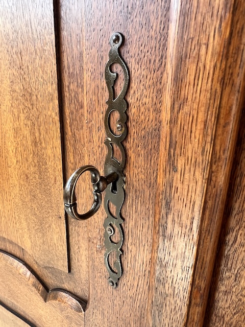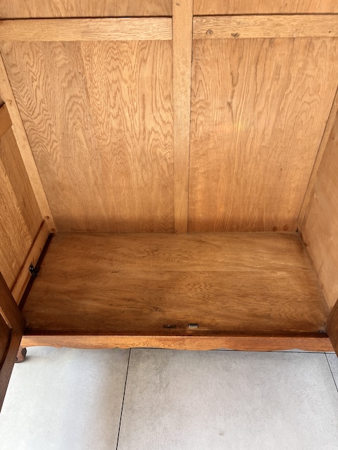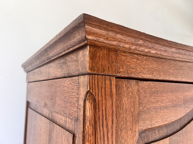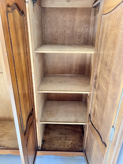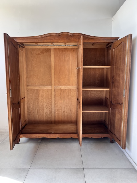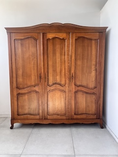Szafa trzydrzwiowa. Bardzo ładna. Wykonana jest w stylu ludwikowskim z drewna dębowego. Jest w dobrym stanie. Nie ma żadnych uszkodzeń ani ubytków. Nosi typowe ślady użytkowania. Zamki są sprawne z kompletem kluczy. W lewej i środkowej części jest drążek. Natomiast w prawej części są 3 półki. Wewnątrz jest zadbana. Szafa jest rozbieralna i do nowego właściciela przyjedzie w elementach. Gotowa jest do wstawienia.