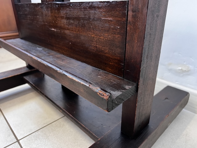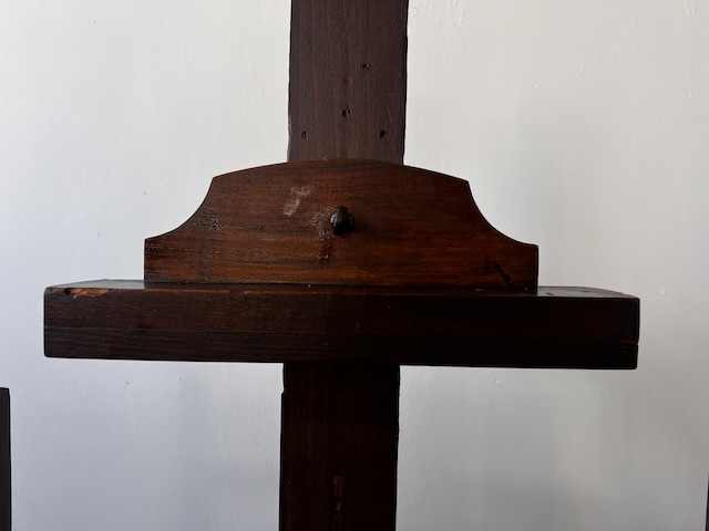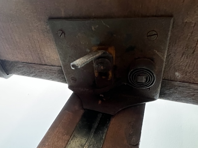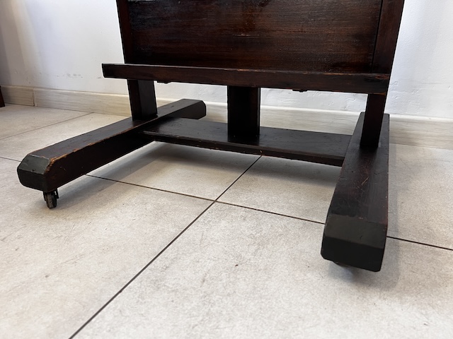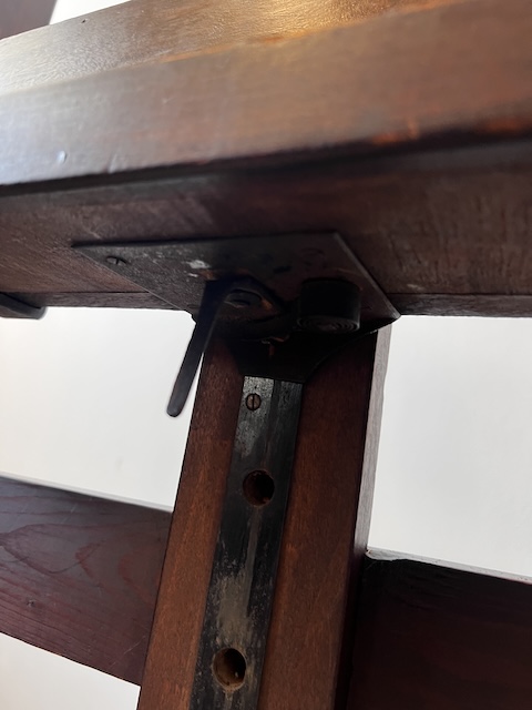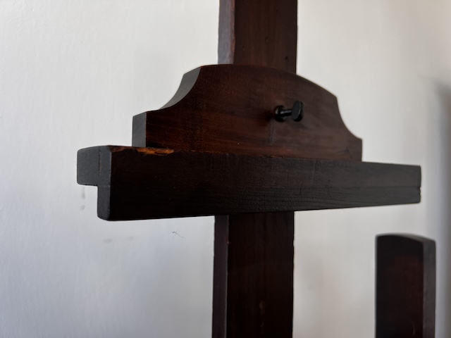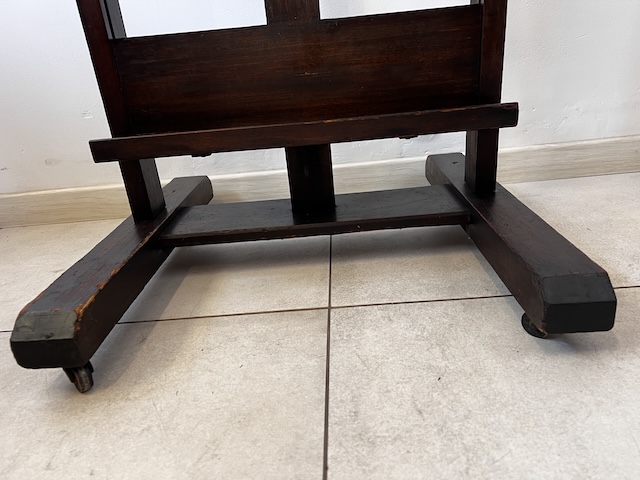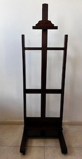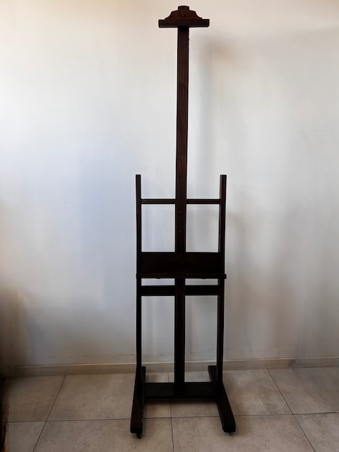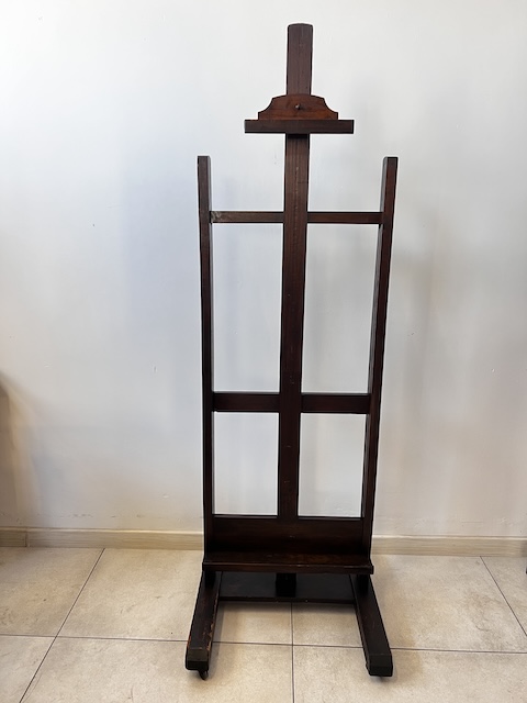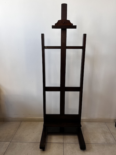Sztaluga malarska studyjna. Wykonana jest z litego drewna dębowego. Posiada metalowy mechanizm zapadkowy do regulowania wysokości. Maksymalna wysokość płótna jakie można tu zamontować to ok 152 cm. Dolną krawędż można ustawić na wysokości 115 cm cm. Zamontowane też są kółka, które ułatwiają przesuwanie sztalugi w pracowni. Jest solidnie wykonana. Nosi typowe ślady użytkowania. Nie ma żadnych uszkodzeń ani ubytków. Jest stabilna. Gotowa jest do dalszej pracy.