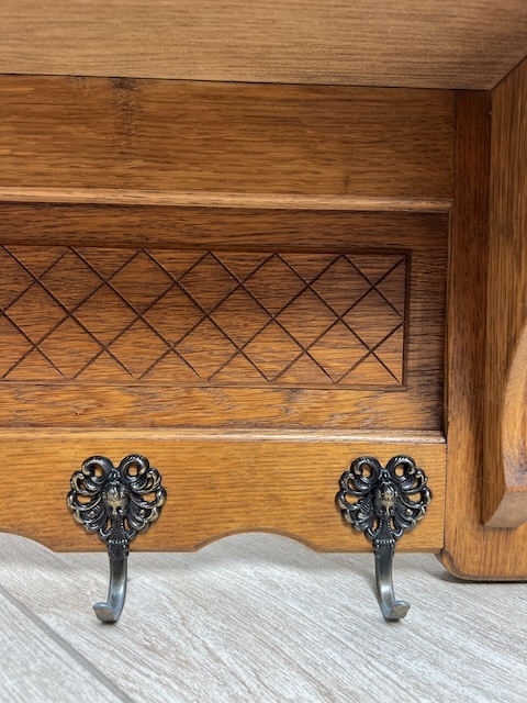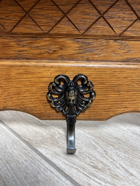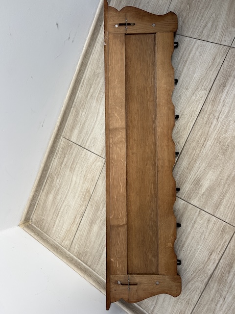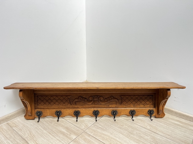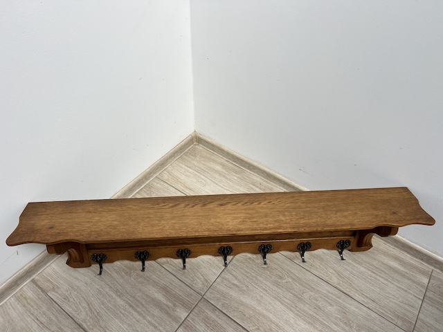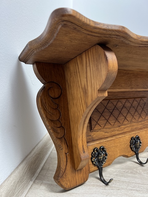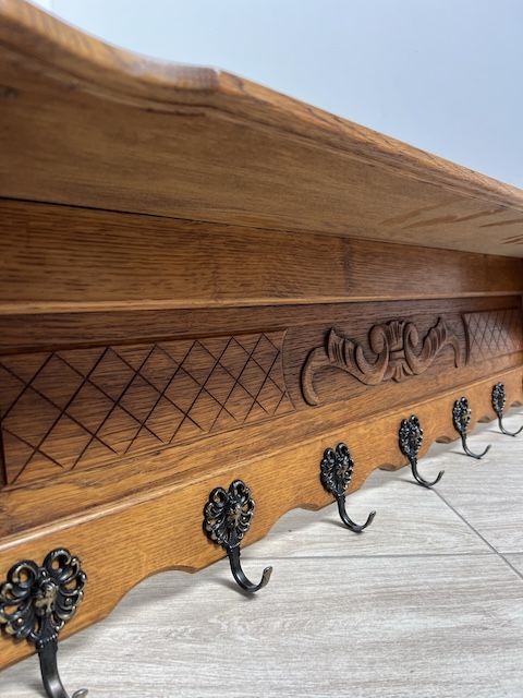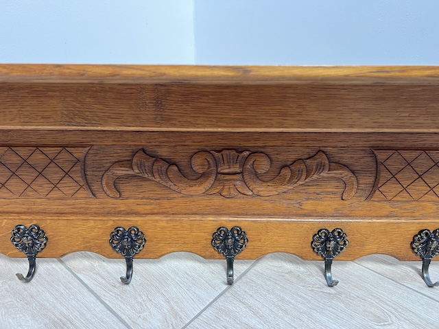 Wieszak ścienny. Bardzo ładny. Wykonany jest z drewna dębowego. Ma półeczkę i 7 haczyków. Jest w dobrym stanie. Nosi typowe ślady użytkowania. Jego stan szczegółowo pokazuję na zdjęciach. Nie ma uszkodzeń ani ubytków. Gotowy jest do zawieszenia.