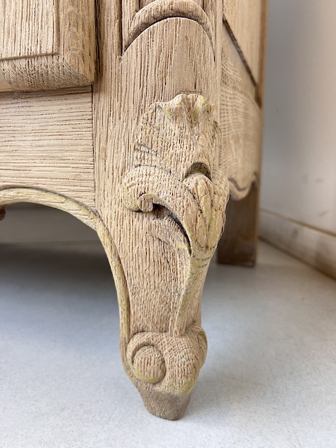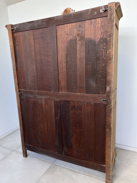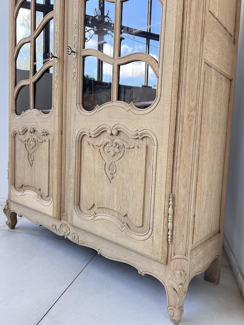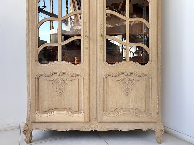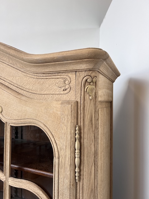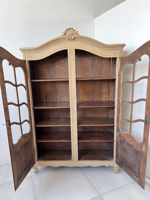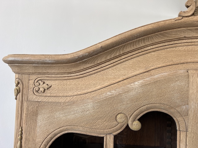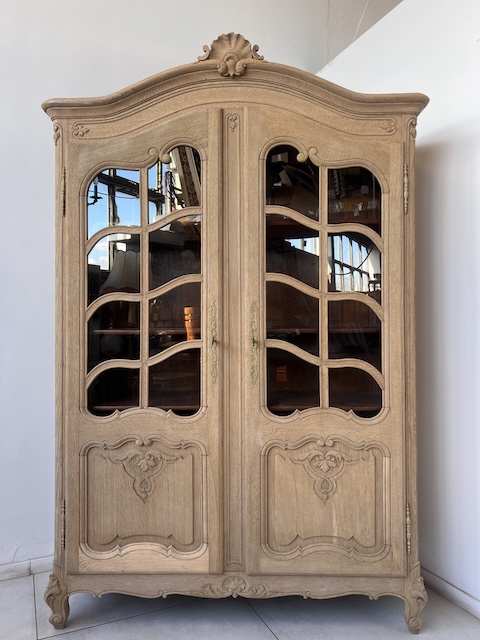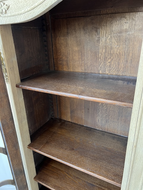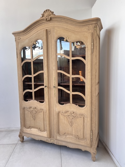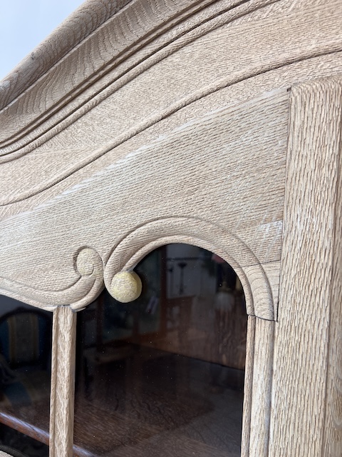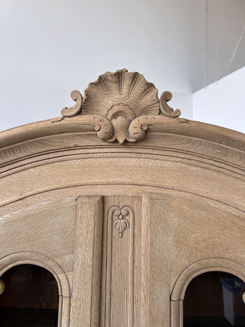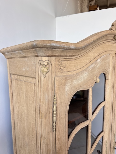 Witryna dębowa z litego drewna. Bardzo ładna. Została oczyszczona z zewnętrznych powłok. Jest teraz profesjonalnie przygotowana do dalszych prac; malowania, woskowania, pastowania. Zamki sę sprawne z kompletem kluczy. Wewnątrz jest 5 półek, których wysokość można dowolnie regulować. Na prawych drzwiach widać sklejenie szprosów (szczegóły na zdjęciach). Witryna solidna, ciężka i masywna. Stan szczegółowo pokazany jest na zdjęciach. Jest rozbieralna i do nowego właściciela przyjedzie w częściach.